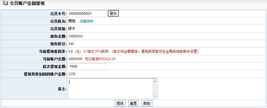 3.在取款金额处输入要取给会员的金额,点确认取款.