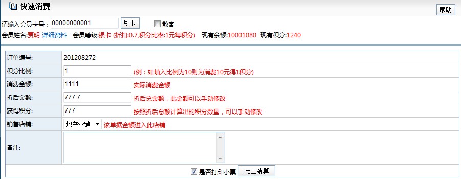 不用选择产品的一种结算方式,直接输入会员的消费金额,就可以完成消费。