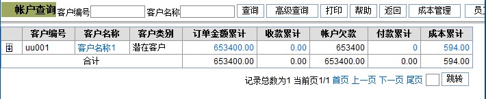 账户查询可以帮助企业快速的查询到企业与客户之间的资金往来情况。 账户查询列出订单金额累计、收款累计、账户欠款、付款累计、成本累计。 按客户编号、客户名称查询出相应客户的账户信息。 也可以点击[高级查询]查找更准确的账户信息。 页面如下