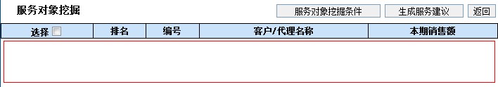 通过服务对象可以按多个条件, 查询出相关客户。查询条件主要有:挖掘类型(价值客户、问题客户、友好客户),日期范围,挖掘条件,挖掘对象( 客户、代理),排名。 根据类型的不同生成不同的服务条件,例如:选择挖掘类型中的价值上升客户,则生成挖掘条件(销售额、 利润额 、交易次数 )。之后确定日期范围,挖掘对象可以多选,填写提取排名前几位,点查询后列出服务对象挖掘列表。