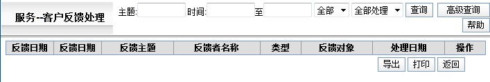 通过客户反馈处理菜单处理客户反馈信息,可以按主题、时间、处理信息类别、反馈处理标志(包括待处理信息和已处理信息)查询客户反馈处理列表,也可以点击页面上的[高级查询]按钮查询跟准确的客户反馈处理信息。 点击客户反馈主题链接查看客户反馈的详细信息,点击反馈者名称链接查看反馈客户的详细信息。 点击[处理]处理客户反馈信息。如果是已经处理的信息,则在列表中处理日期一列显示出处理的日期,没处理的则该列为空。 反馈处理页面如下图:
