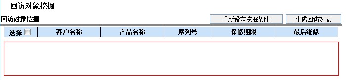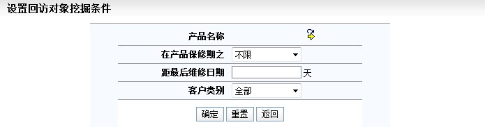产品售出后,根据维修条件对客户进行回访。生成待回访的客户名单,下图是进入本功能需要首先指定的回访客户的挖掘条件