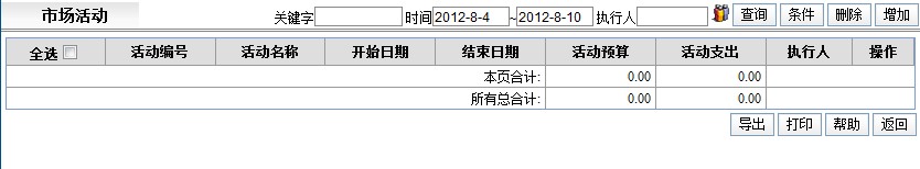 点击活动编号查看市场活动详细信息。点击[添加]进入活动编辑页面,点击[删除]删除一条活动信息,点击[选择]选择市场活动参与人,并可以生成市场销售机会。市场活动管理列表如下: