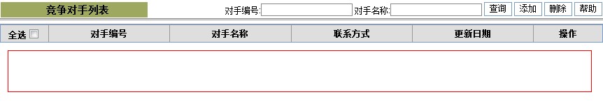 首先进入竞争对手列表页面,对竞争对手的管理,可以根据竞争对手编号、竞争对手名称查询竞争对手的信息。可以增加、删除、修改竞争对手,查看竞争对手产品详细信息。 竞争对手列表页面如下图:
