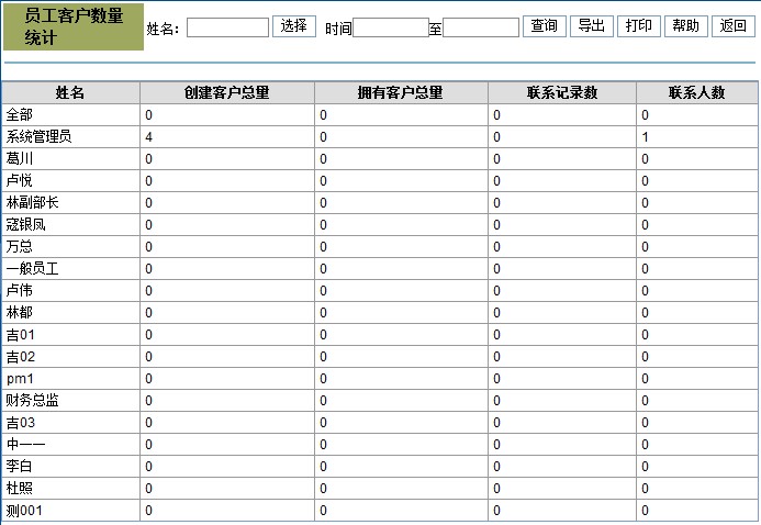 通过业务员统计管理对所有业务员创建客户总量、拥有客户总量、与客户的联系记录数以及联系人数的管理。在查询条件的时间内可以查看员工的相应的信息。