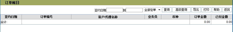 通过订单账目可以按签约日期查询这个时间段内所有订单的信息。也可以选择订单的活动状态(活动订单、历史订单)查看。点击[高级查询]可以查询更准确的信息。可以查看订单总金额和客户/代理已付金额。 订单账目页面如下图: