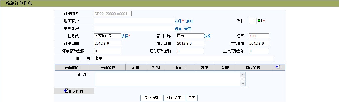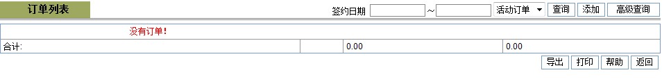 通过订单信息可以进行添加、删除、修改、查看订单。按签约日期、订单活动标志(活动订单、历史订单)查询订单列表,通过[高级查询]可以查询出更准确的信息。由于产品报价单可能会很多条,我们采用分屏显示的方式,在此区域内您可以看见符合您目前查询条件的记录条数,以及当前所在的页数、总页数等信息。通过“首页”、“尾页”、“上一页”、“下一页”连接,您可以方便的在页面中进行前后浏览。