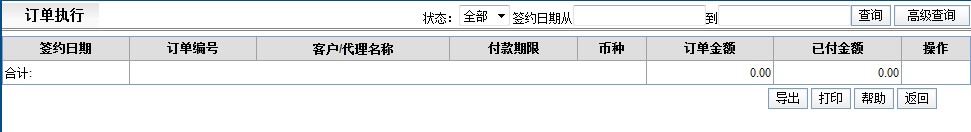 订单执行是通过对订单信息进行执行。按订单状态(终止、执行)、签约日期查询订单,也可以通过[高级查询]查询更准确的订单信息。点击订单编号可以查看订单的详细信息。点击客户/代理名称可以查看客户/代理的信息。