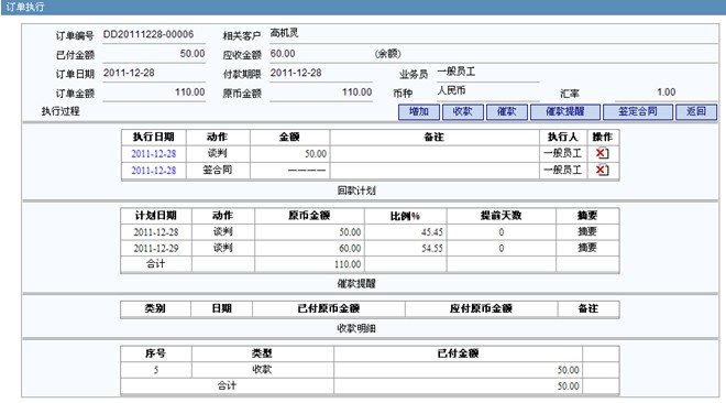 点击[增加]可以对订单进行收款、催款、催款提醒、签订合同操作 |