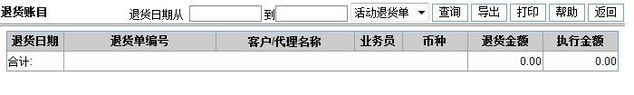 首先进入页面显示的是退货单列表。列出退货单总金额和需要执行的金额。按退货日期、退货单活动标志(活动退货单、历史退货单)查询退货单列表。点击退货单编号可以查看退货单详细信息。点击客户/代理名称查看客户/代理详细信息。 退货账目页面如下: