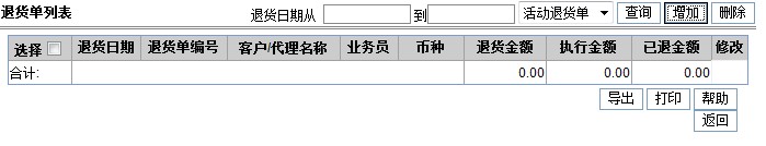 通过退货单信息可以查看、编辑、添加、删除退货单。按退货日期、退货单活动标志(活动退货单、历史退货单)查询退货单列表。 退货单页面如下: