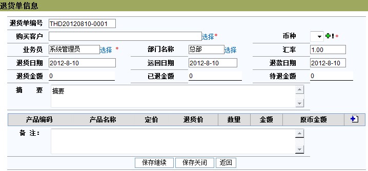 点击[增加],可以添加一条退货单信息 点击[编辑]可以编辑退货单信息 点击退货单编号可以查看退货单详细信息 点击客户/代理名称查看客户/代理详细信息 编辑和添加退货单页面: