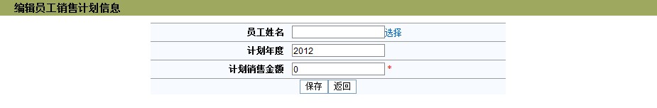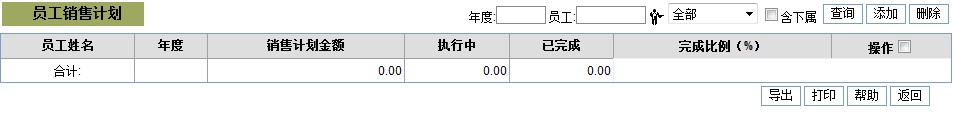 在年度、员工中填写相应的信息后,点击[查询]按钮,可以查询更准确的信息 选中操作中的复选框,点击[删除]按钮,可以删除相应员工的销售计划 如果销售计划比较多,可以通过‘首页’、‘上一页’、‘下一页’、‘尾页’查看,也可以填写相应的数字,点击[跳转]按钮,跳转到您要查询的页 点击[导出]按钮,可以导出员工的销售计划 点击[打印]按钮,可以打印员工的销售计划 点击[帮助]按钮,可以查看帮助信息 点击[返回]按钮,返回上一页面 点击[添加]按钮,添加员工的销售计划,添加页面如下图: