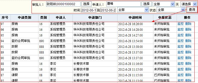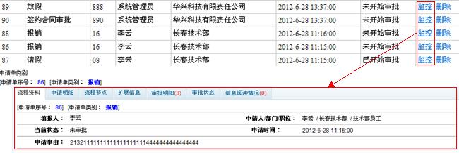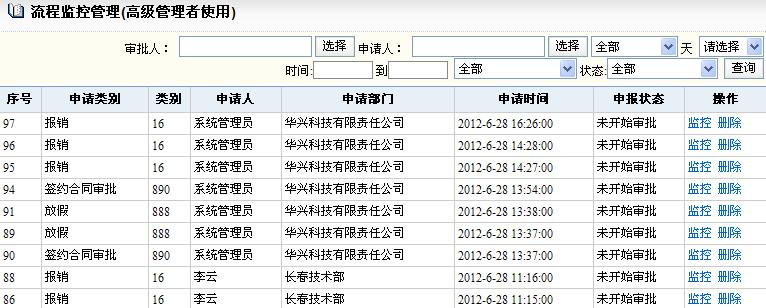 此界面可以查看所有正在审批和审批完毕的表单,包括查看申请信息、当前状态、当前流程、审批记录和阅读记录等。 对审批中的表单可以更改本步审批人,进行催办,对审批完毕的表单可以进行归档,可以删除错误的表单流程,可以打印表单。