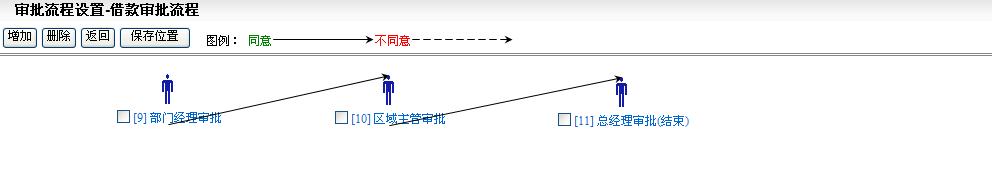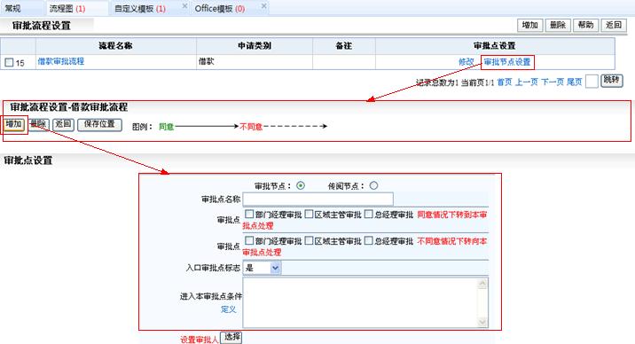 流程设计是实现审批流程运转的基础工作,简单的说就是设置节点、流程和模板的过程。将自身的业务和管理流程规范化和细致化,通过表单的有效审批流程过程来实现企业内部的管理和工作一体化。 在新建流程的时候,你可以设置该流程的“是否启用”和“是否显示申请事由”,前者可以修改该流程,后者可以显示该 流程的申请事由,没有使用权限的用户将看不到该流程. ![]() 在新建完成流程后,点击流程图建立审批流程,然后点击审批点设置,进行审批的设置: