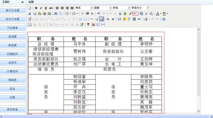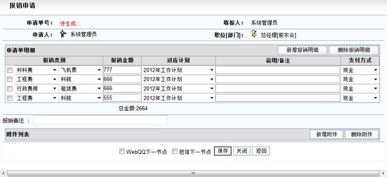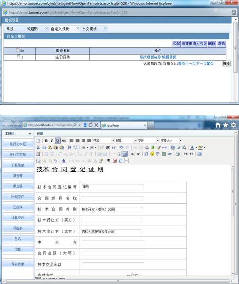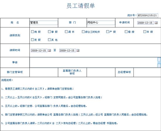 审批模板设置:模板就是附带有流程的标准格式的管理表单,如报销单、请假单、请款单等,它一般由管理员设置好,普通用户直接调用即可。 ![]() 设置方法是首先单击自定义模板->然后点击新模板进入模板添加界面->模板添加完成后点击编辑自定义模板,进入模板编辑界面,在编辑模板之前建议先用word文档将模板的基本形式设置出来,我没可以通过复制粘贴将word文档中的模板复制到自定义模板中,让回根据需要对需要编辑的地方进行相对对应的控件设置。注意在所有自定义模板设置完成后一定要绑定申请人可以修改的控件不人申请人是无法操作模板的。 拓维OA系统的审批流程模板分为三种:文档型、表单型、签批单,包括Word、Excel、WPS、HTML等七种格式。 ![]() 用户可根据自己的实际情况,某些模板采用文档型,某些模板采用HTML表单型。如人事任免等一般为可采用文档型模板,而采购单、销售单一般采用HTML表单型模板。 1) 文档型。即WORD、EXCEL、WPS模板。文档型模板适用于审批内容是基于文档的,以文字内容为主的文件,如合同、发文等。一般不需要对文档内容进行统计、按域查询,文档型模板设计简单,并可以设置文件套红、痕迹保留、电子签名、加盖电子印章等 ![]() 2) 表单型。即HTML模板,也称电子表单,该种类型的模板是基于HTML表单的,类似于一个应用系统,可以有N多个输入域,并且与实体的数据表相结合,可以方便地对每个域进行数据查询和统计汇总。适用于需要对审批单的数据进行统计查询的文件。如下图示: ![]() 3) 签批单。签批单可有效实现html表单和office文档的结合。可实现正文是word或excel文档,而审批单本身是以html表单格式进行审批的单据。 文档型表单:包括WORD、EXCEL、WPS等格式表单。文档型模板适用于审批内容是基于文档的,以文字内容为主的文件,如合同、发文等。一般不需要对文档内容进行统计、按域查询,文档型模板设计非常简单,并可以设置文件套红、痕迹保留、电子签名、加盖电子印章等。如下图所示: ![]() 电子表单:也称HTML表单,该种类型的模板是基于HTML表单的,类似于一个应用系统,可以有N多个输入域,并且与实体的数据表相结合,可以方便地对每个域进行数据查询和统计汇总。适用于需要对审批单的数据进行统计查询的文件。如下图示: ![]() 文档+电子表单:文档+电子表单可有效实现文档型表单和电子表单的结合,即正文是WORD/EXCEL文档,以便于编辑,而审批单(签批单)是HTML表单,以便于统计数据,这样使用起来非常灵活,适用于需要同时使用文档文件和HTML表单的审批文件。 如合同审批单:签批单是HTML格式的,合同正文是WORD格式的; 发文审批单:签批单是HTML格式的,文件正文是WORD格式的。 文档+电子表单中,可以对HTML审批单的数据单独进行统计汇总。 ![]() 明细表:可以让你在表单中添加多个明细条目,并且在报表中对明细表的内容分别统计,使统计更有针对性。如下面的报销单中红框的部分就是明细表.