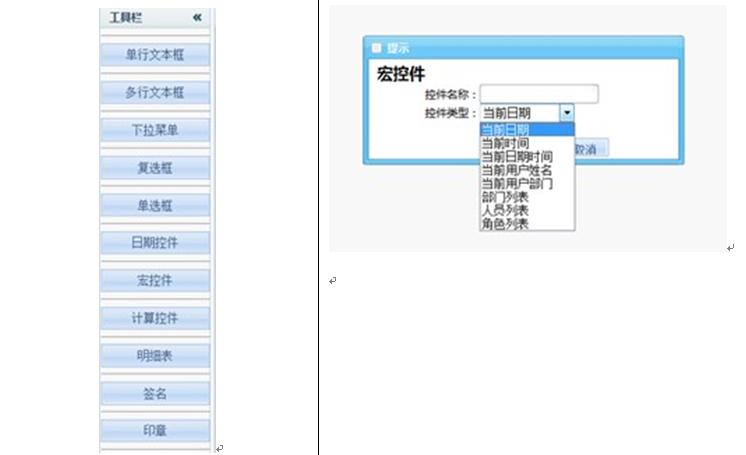 表单宏控件:宏控件是用于把系统中其它模块的信息插入至表单中,比如“输入框”、“日期选择”框、“部门选择”框、“审批人签名”等。这样申请人和审批人就可以从宏控件中直接选取相关内容,而无须手工填写,节省工作时间,降低操作难度和差错率。 ![]() |