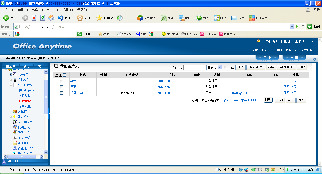 点击新曾可以添加新的名片。 点击类别管理对类别进行管理,可以添加、修改、删除等操作。 点击列表中的姓名,可以查看名片信息;点击手机可以发送短信;点击修改可以修改名片信息;点击上传可以上传附件、图片。