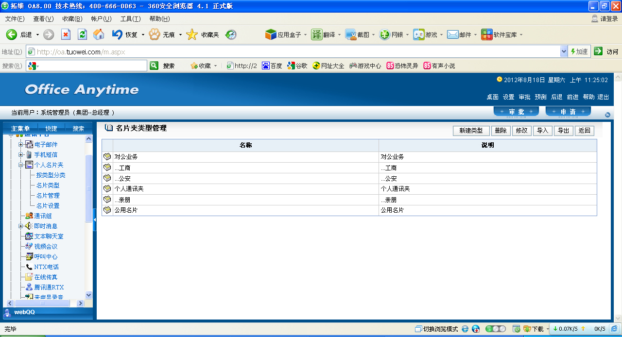 点击列表中的名称,再点击删除,可以删除对应的类型;点击修改,可以修改对应的类型。