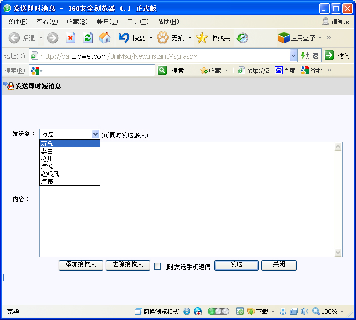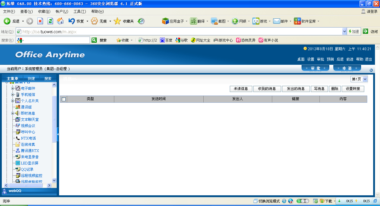 本系统用户间的即时通讯工具。 左侧功能树型列表中单击“即时消息”,出现如下图所示页面