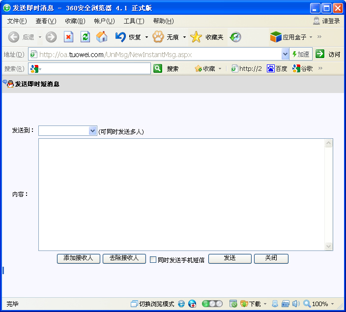 在“内容”文本框中键入要发送的内容,击“发送”即可。 提示: 分别单击“未读消息”、“收到的消息”和“发出的消息”,可查看未读的消息、收到的消息以及发出的消息。