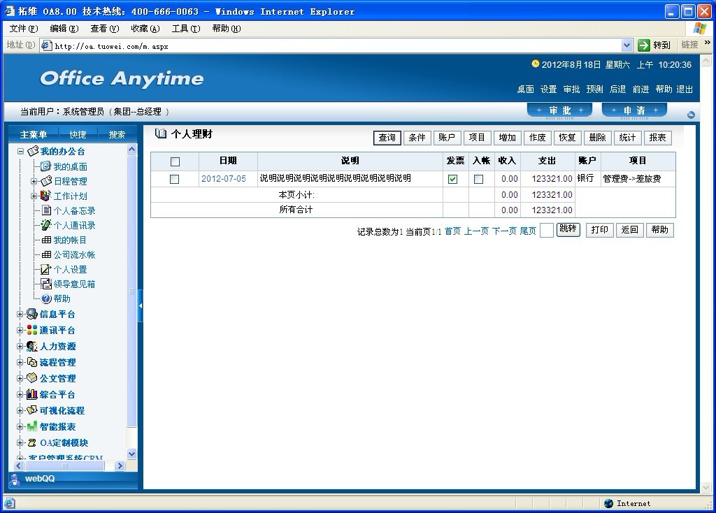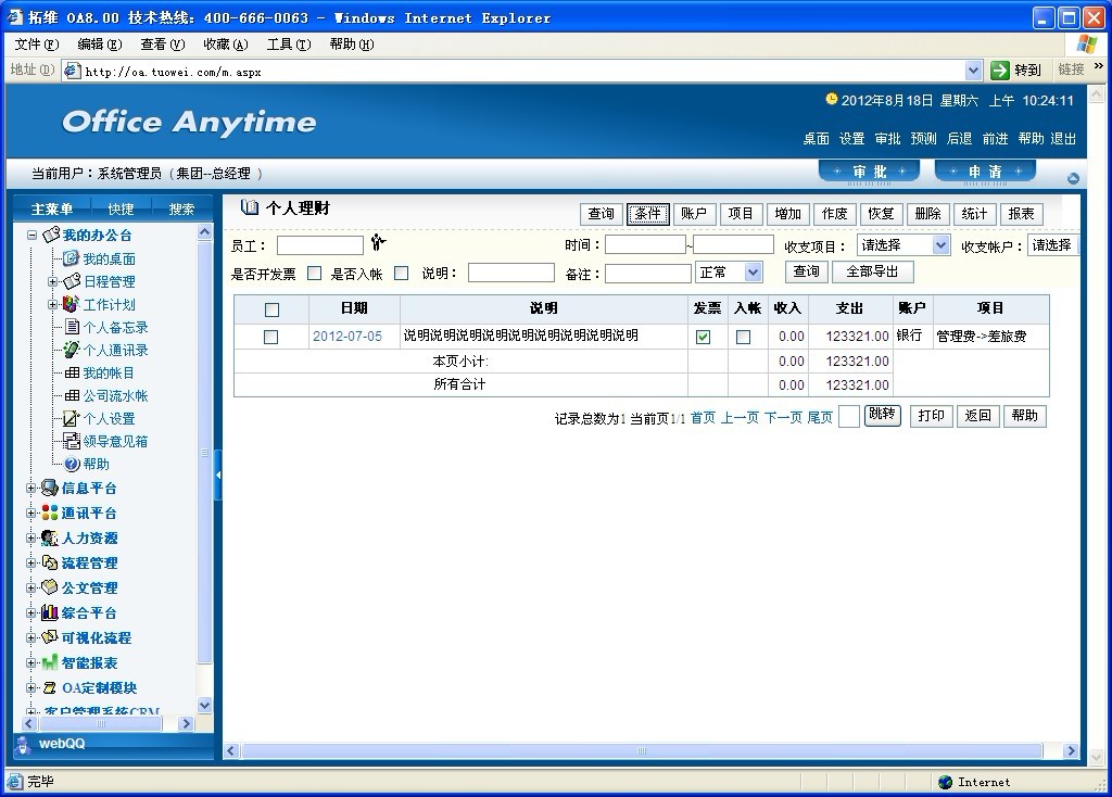 个人理财是为员工提供了一个个人日常财务收支管理的辅助功能,员工可以使用本功能设置多个理财账户,进行日常收支的登记处理,同时可以对指定时期的收支情况进行查询统计处理。个人理财主界面如下图: