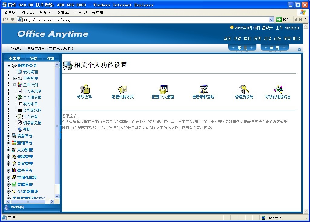 个人设置是为提高员工的日常工作效率提供的个性化服务功能。在这里,员工可以及时了解需要办理的各项事务,查看自己所需要的内容或者 操作自己所需要的功能连接,管理个人的登录口令,查询个人的登记记录,以防有人冒名顶替。