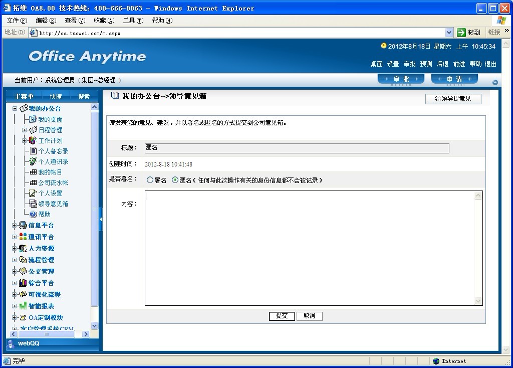 单击右上角的“给领导提意见”按钮进入提意见界面,根据要求正确填写相关内容,同时您可以选择为匿名或署名提议如图。