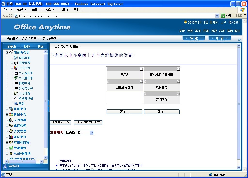 点击下面的“添加”按钮,可以分别在左、右两列添加新的内容模块,按每个内容模块左上角的“×”按钮,可以从桌子上去除该内容模块,用鼠标拖动内容模块上方的深色条,可以移动内容模块的位置。