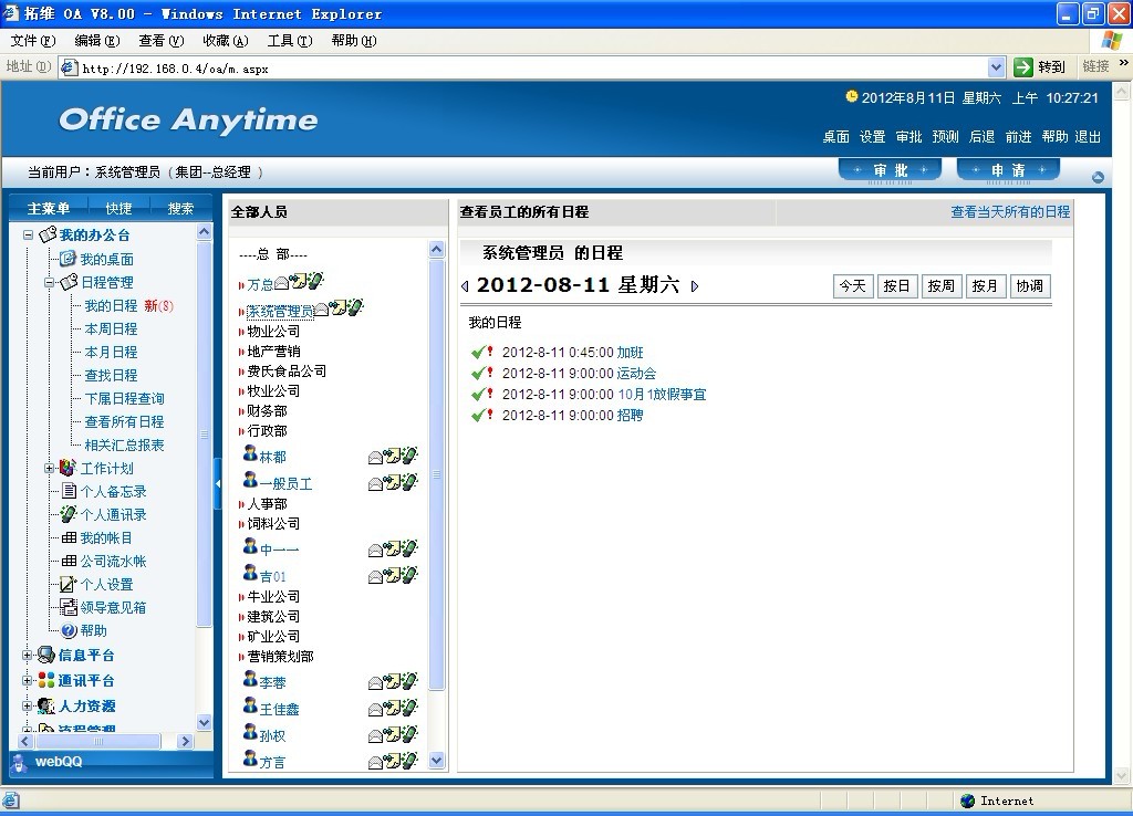 此功能可以按日、周、月查看所有职员的日程按排情况。