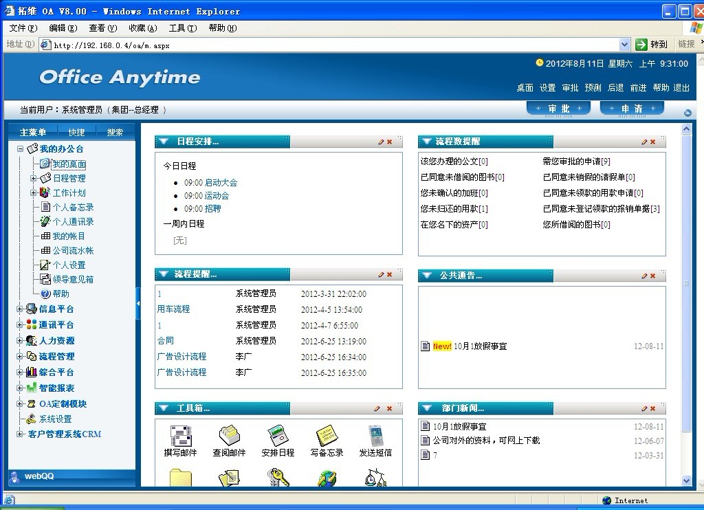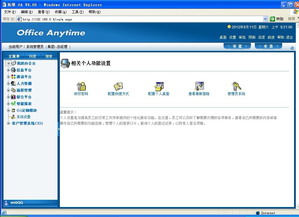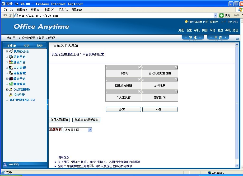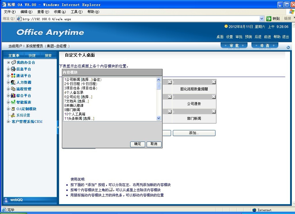 1.我的桌面模块是为提高员工的日常工作效率提供的个性化服务功能。 我的桌面设置 ![]() 首先:点击设置"->" 配置个人桌面 进入配置个人桌面界面