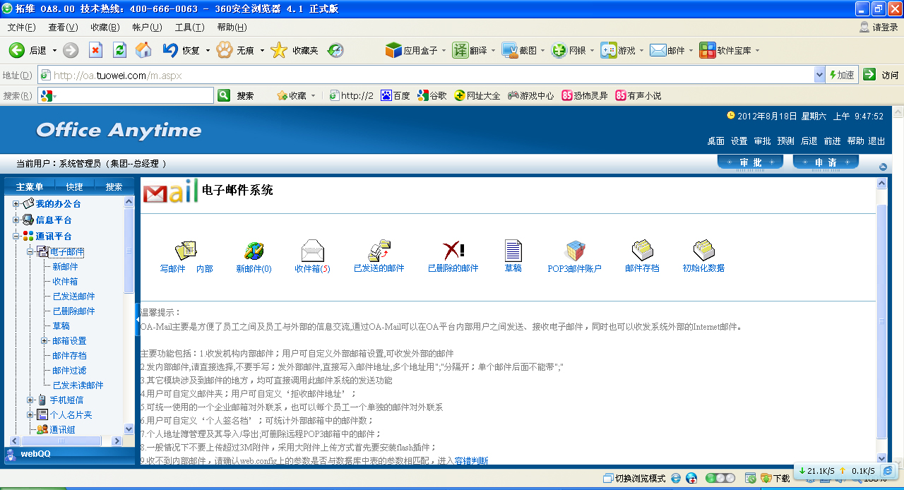 OA-Mail主要是方便了员工之间及员工与外部的信息交流,通过OA-Mail可以在OA平台内部用户之间发送、接收电子邮件,同时也可以收发系统外部的Internet邮件。