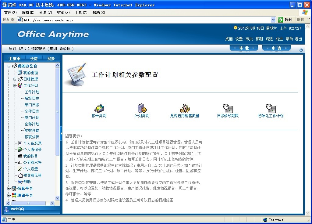 在此处可以对报告类别、计划类别、是否启用销售数量、日志修改期限、初始化工作计划等的设置。