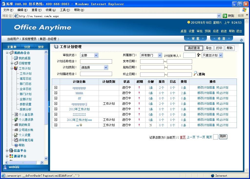 此功能可根据不同的查询条件,查询出所属部门内的全部工作计划。点击高级查绚输入相应的查询条件既得到所查询的相应结果;点击导出既可把所查询到的计划内容导出成表格;点击打印既打印计划内容。