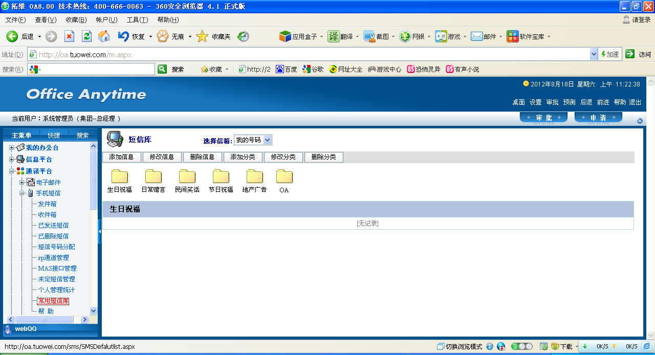单击选中文件夹,再点击修改分类可以修改目录;点击删除分类可以删除目录。点击添加分类可以添加新的目录。 选中最下面的列表中的数据,点击修改信息可以修改选中的信息;点击删除信息可以删除选中的信息。点击添加信息为对应的目录添加新的信息。