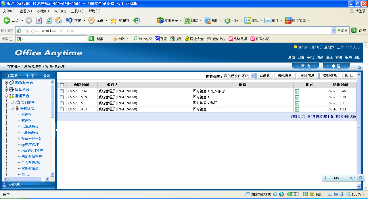 此界面可以轻松查看所有自己已发送短信。