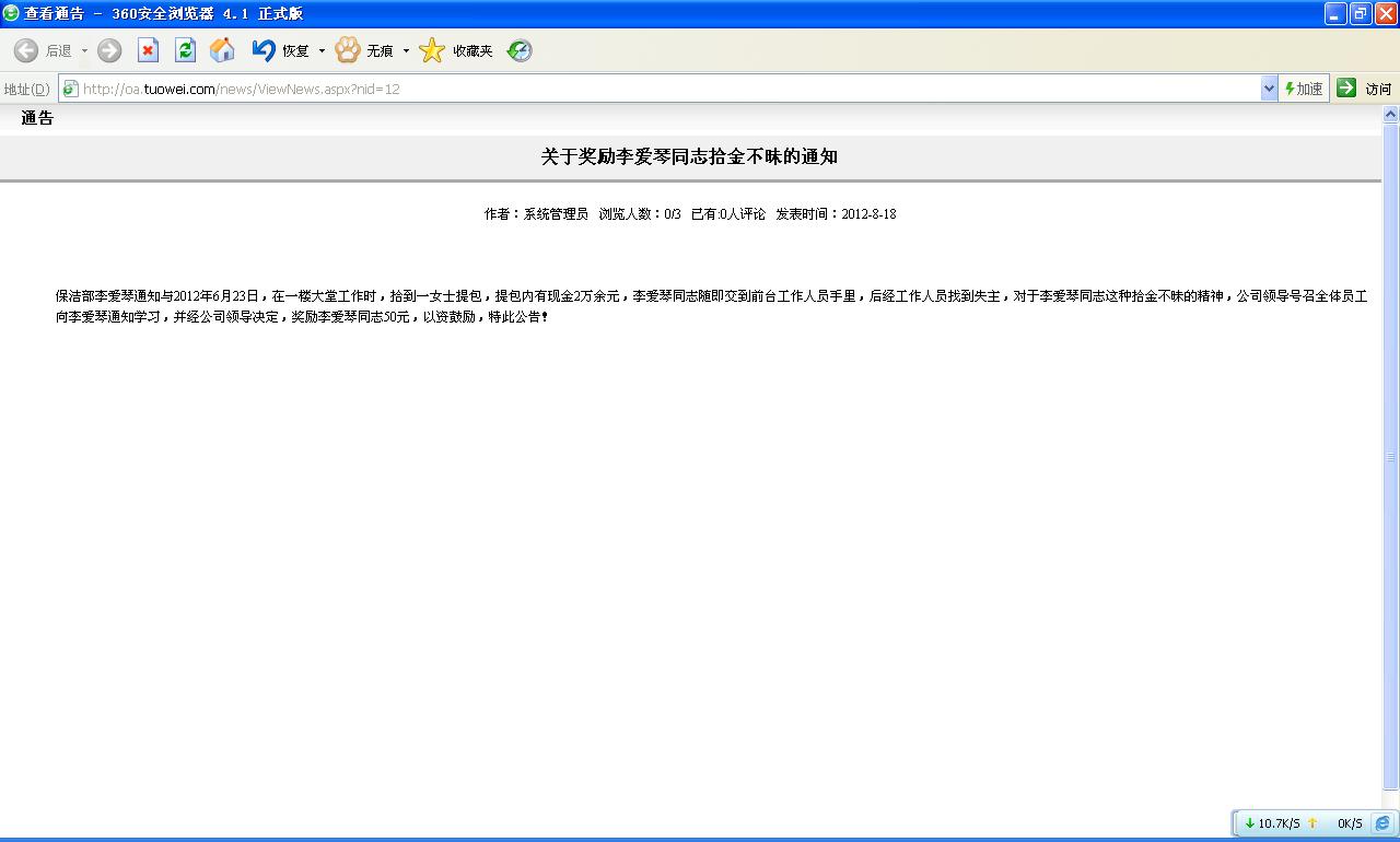 单击“操作”按钮对新闻内容进行修改 功能,如果单击“标题”连接进入查看页面。下图界面: