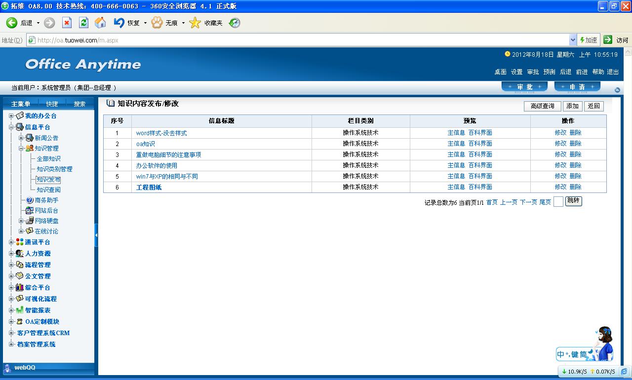 显示、查看已经发布的知识信息。可以点击高级查询按钮显示查询条件,按照输入的信息,点击查询按钮即可筛选出您需要的信息。点击添加按钮可以增加新的信息。