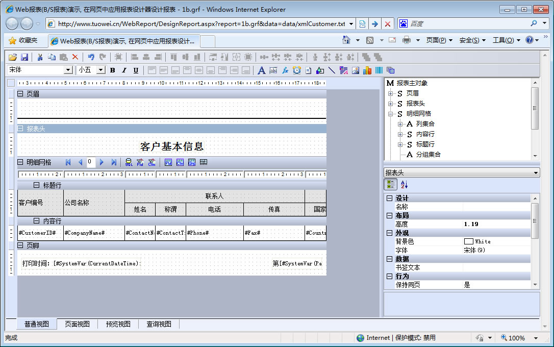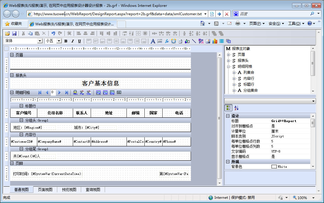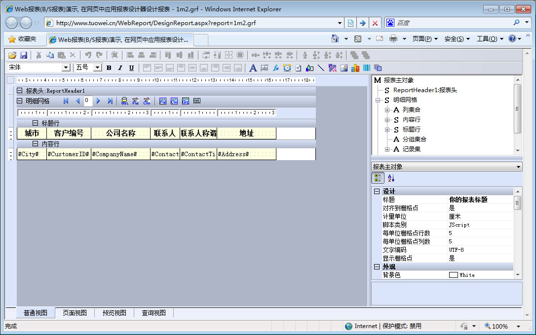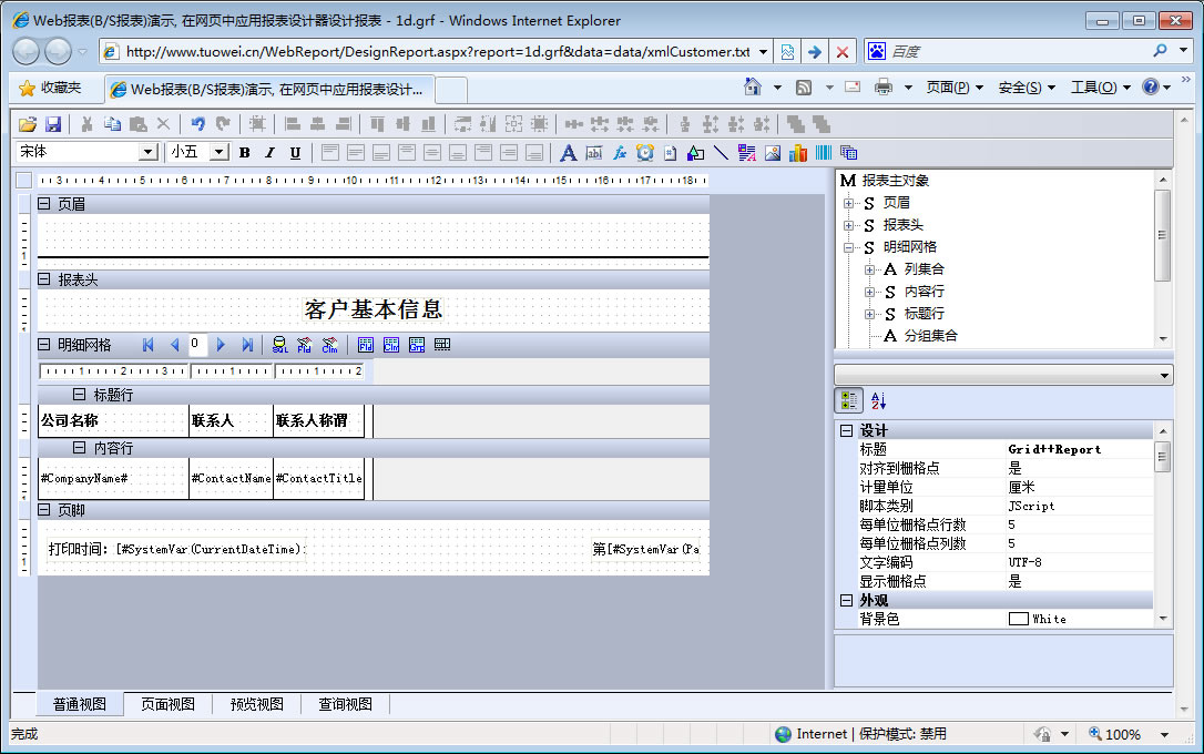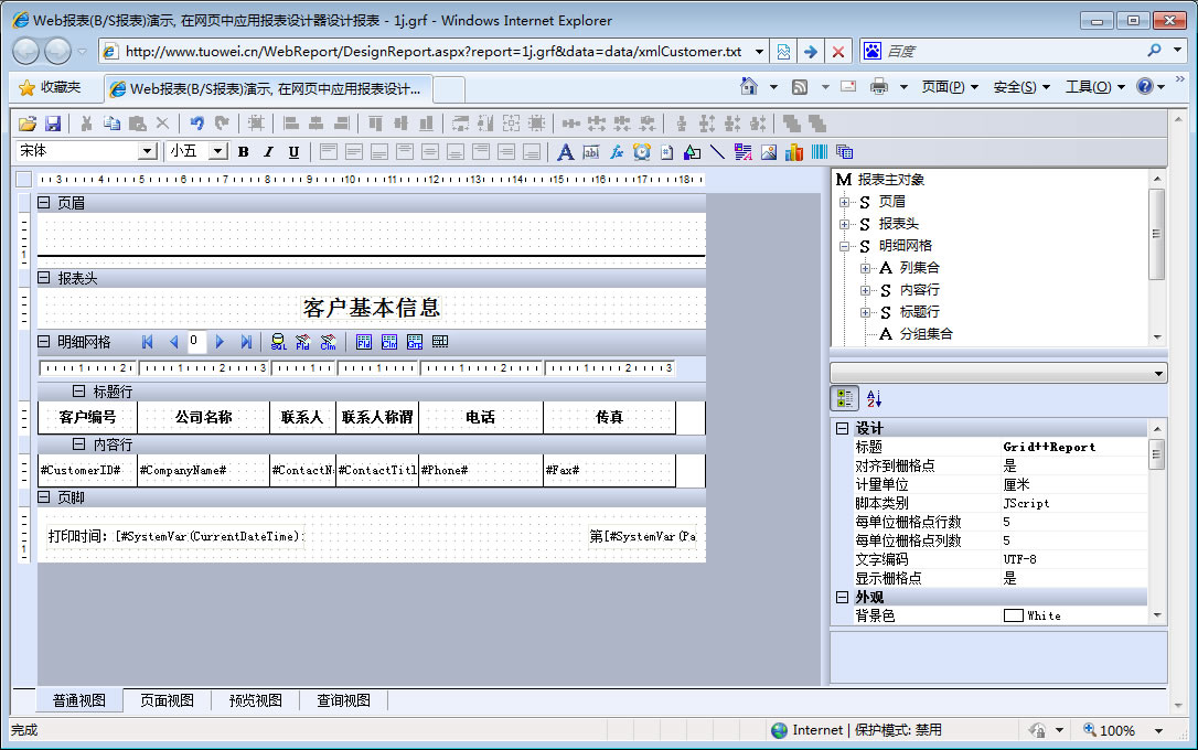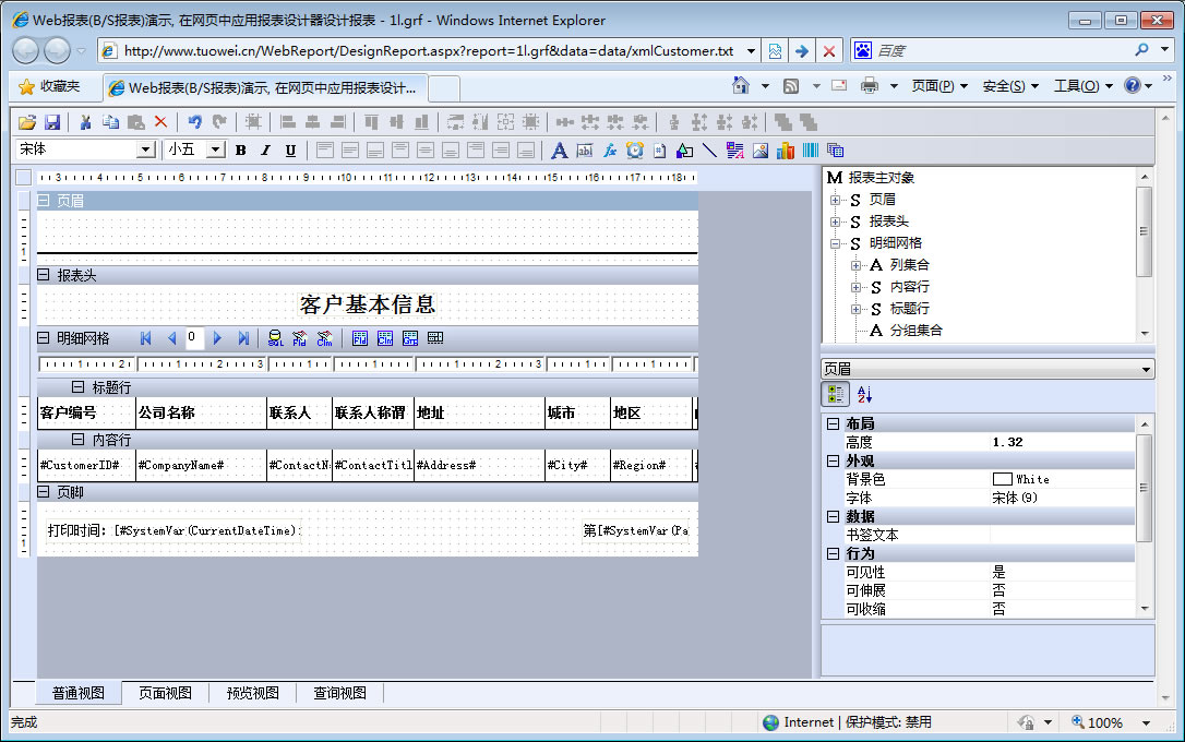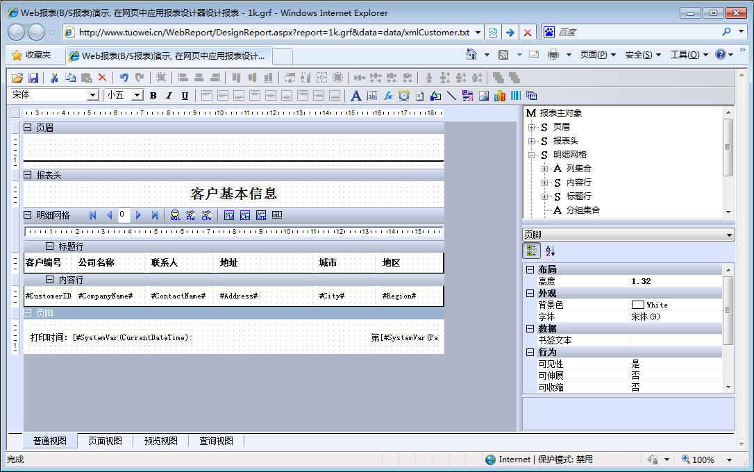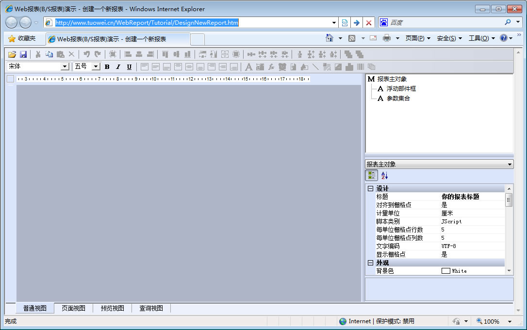 初次访问会自动下载安装报表插件,需要等待几分钟。始终不能看到演示报表,请看关于 IE 安全设置。
