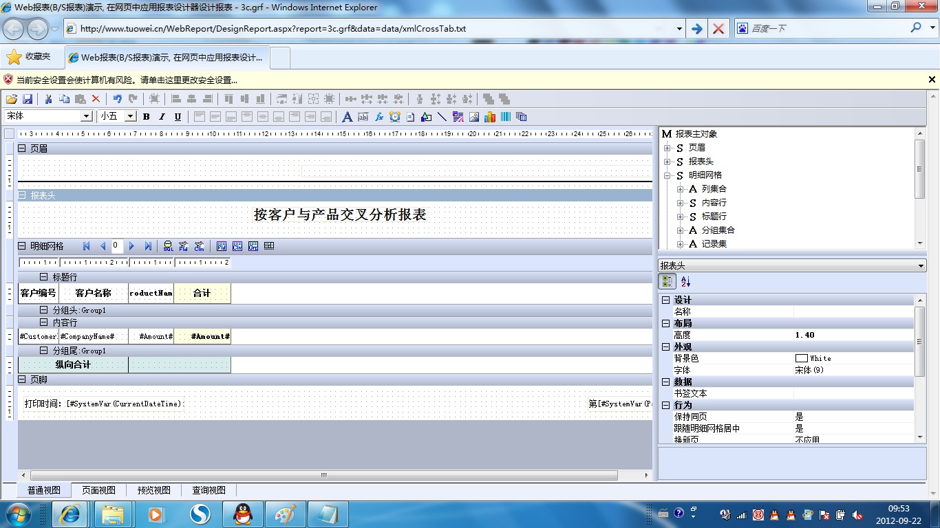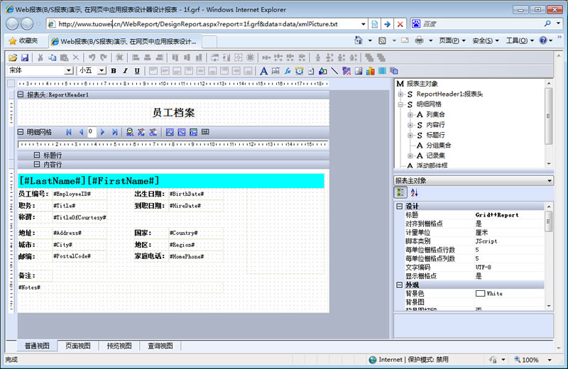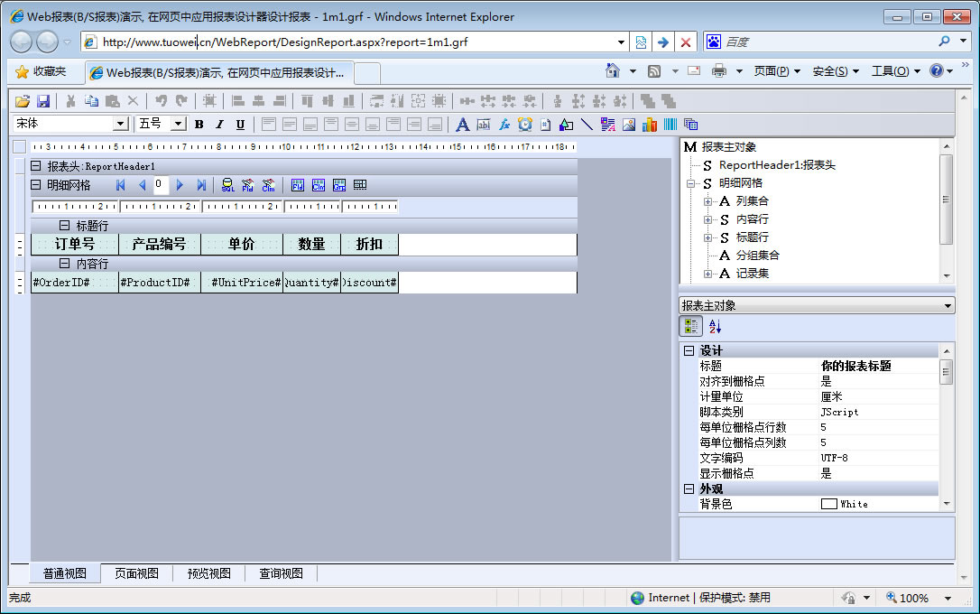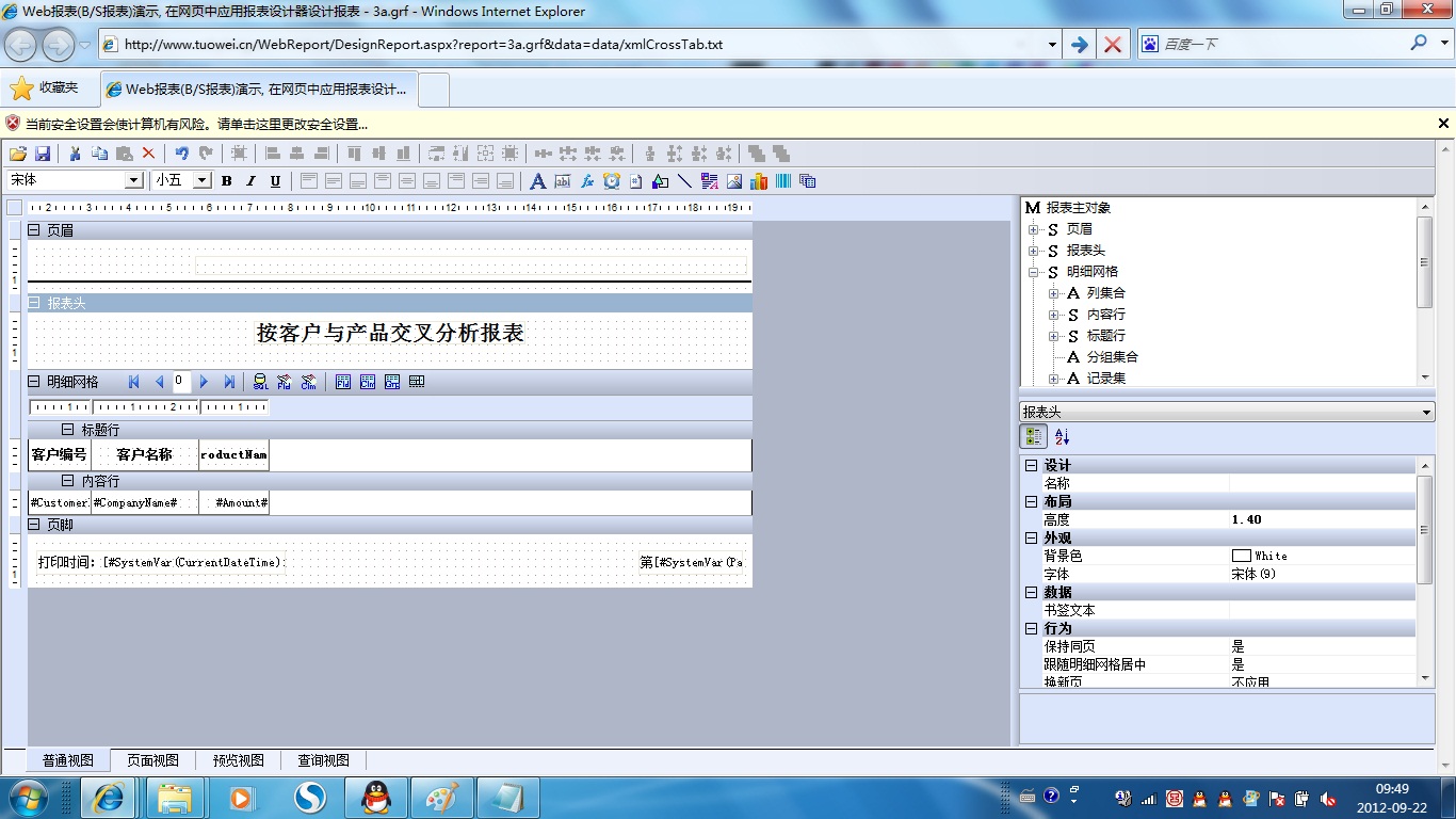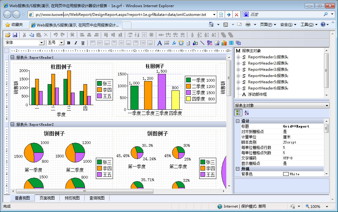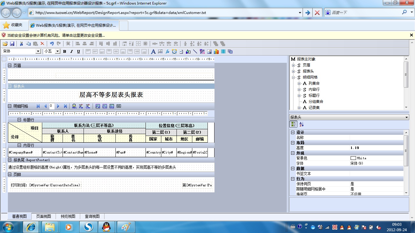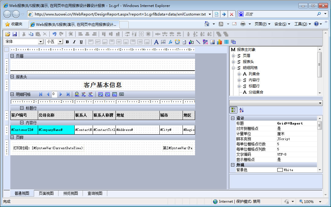 初次访问会自动下载安装报表插件,需要等待几分钟。始终不能看到演示报表,请看关于 IE 安全设置。
