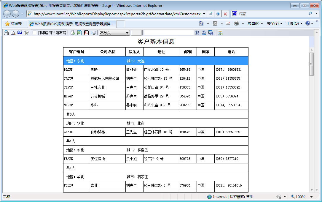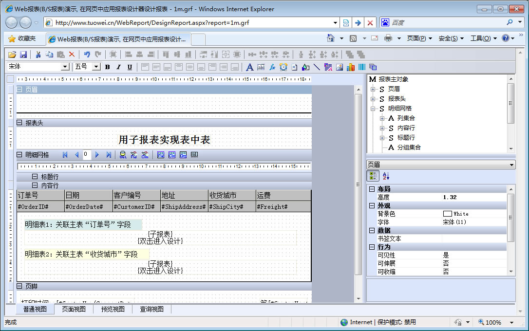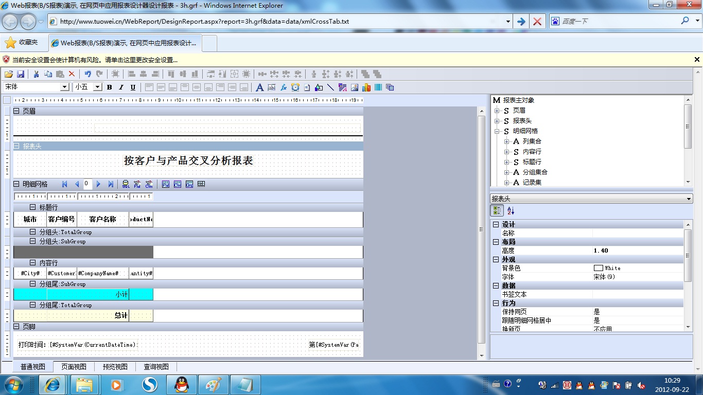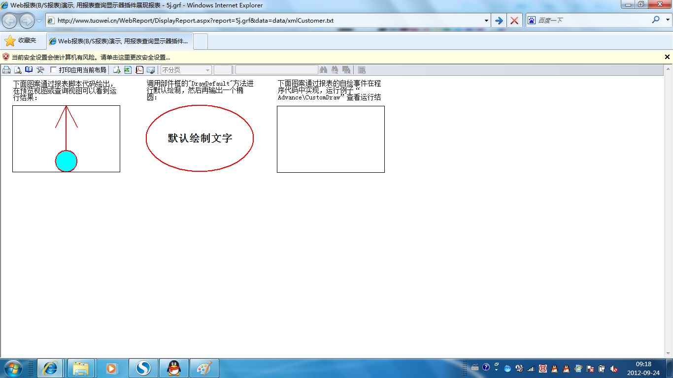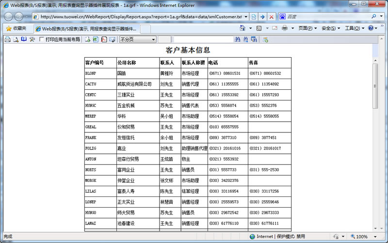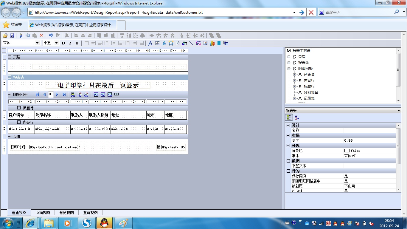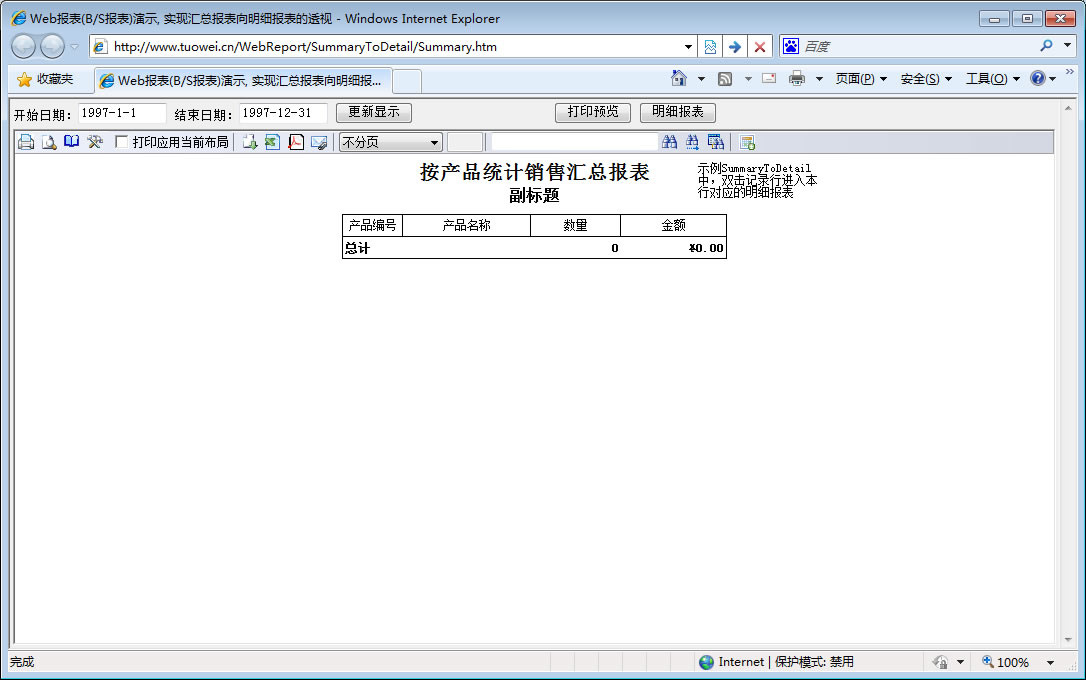 初次访问会自动下载安装报表插件,需要等待几分钟。始终不能看到演示报表,请看关于 IE 安全设置。