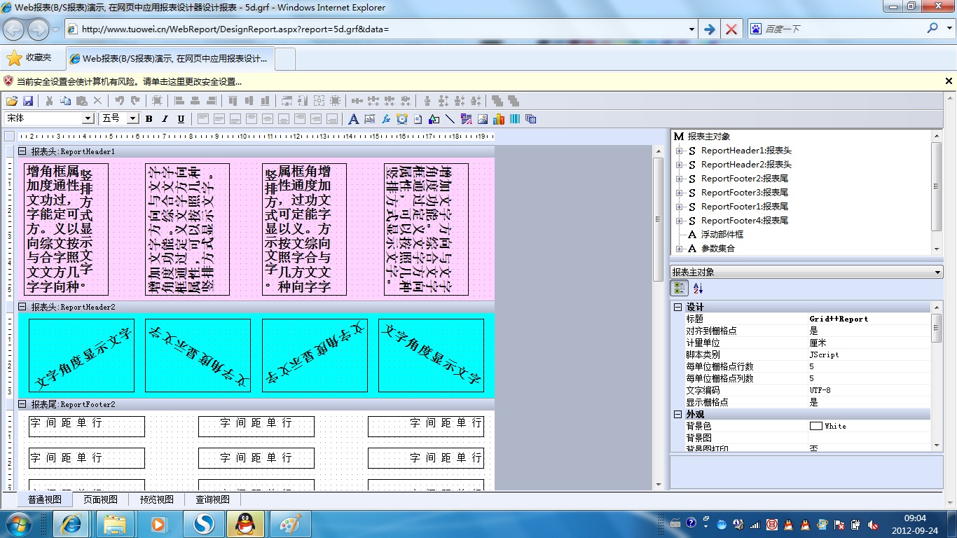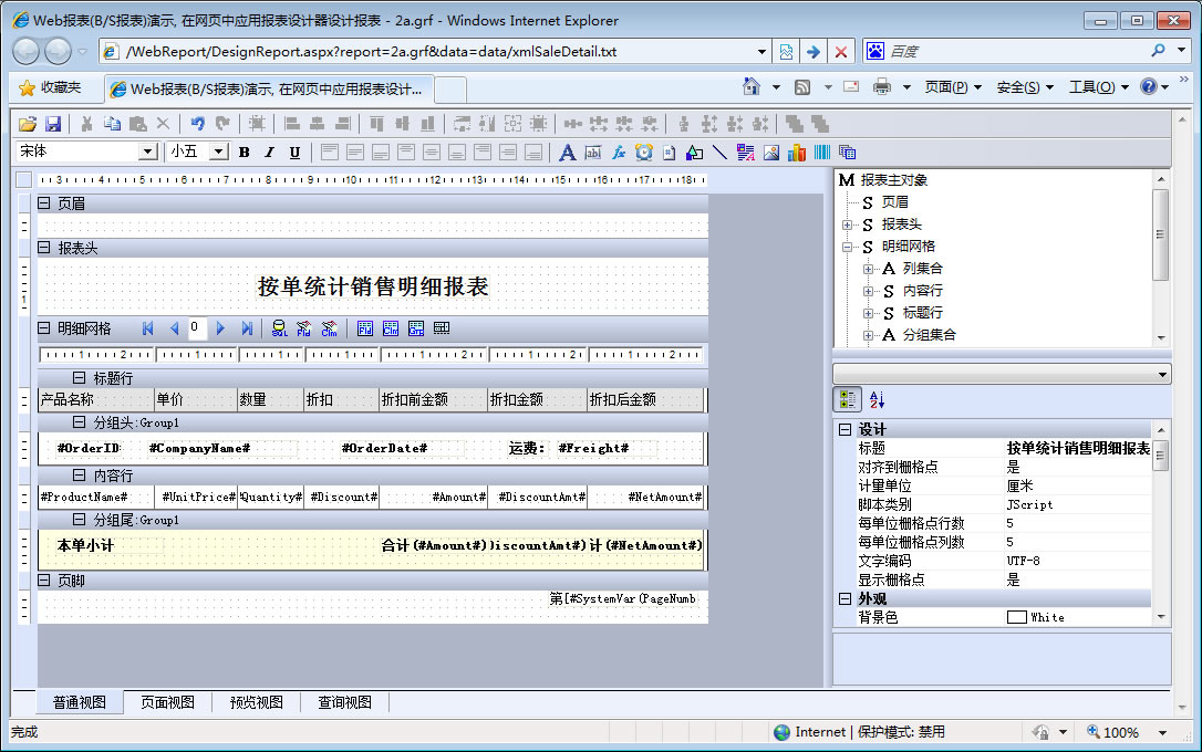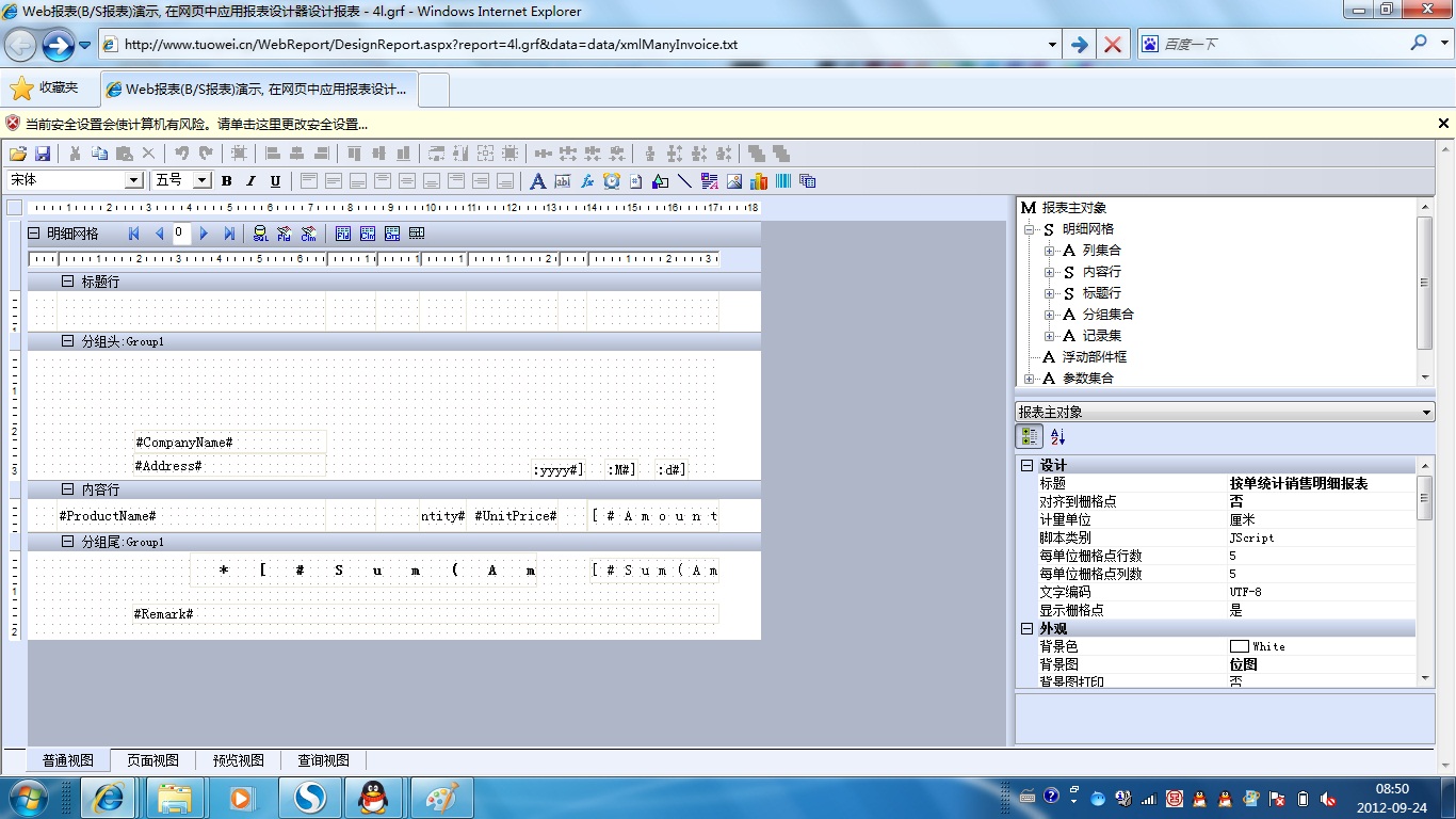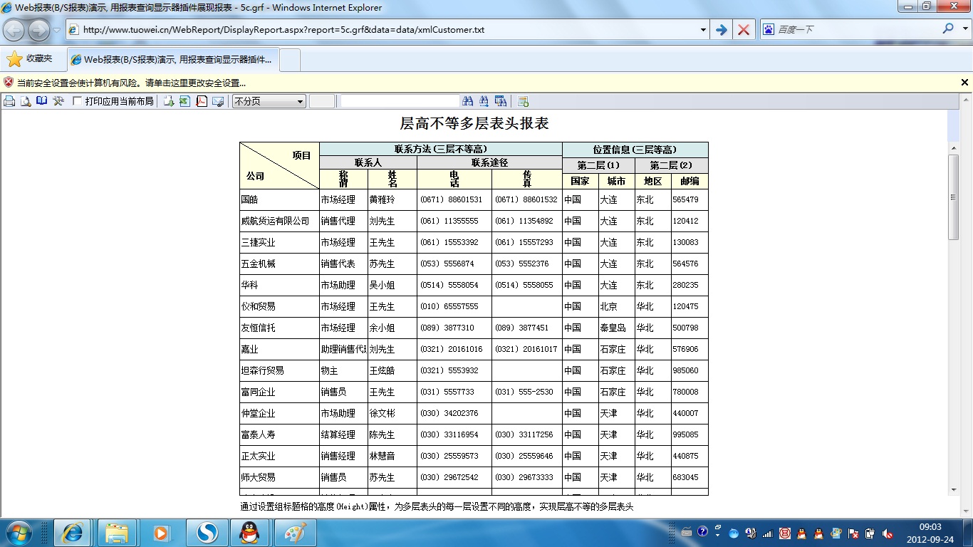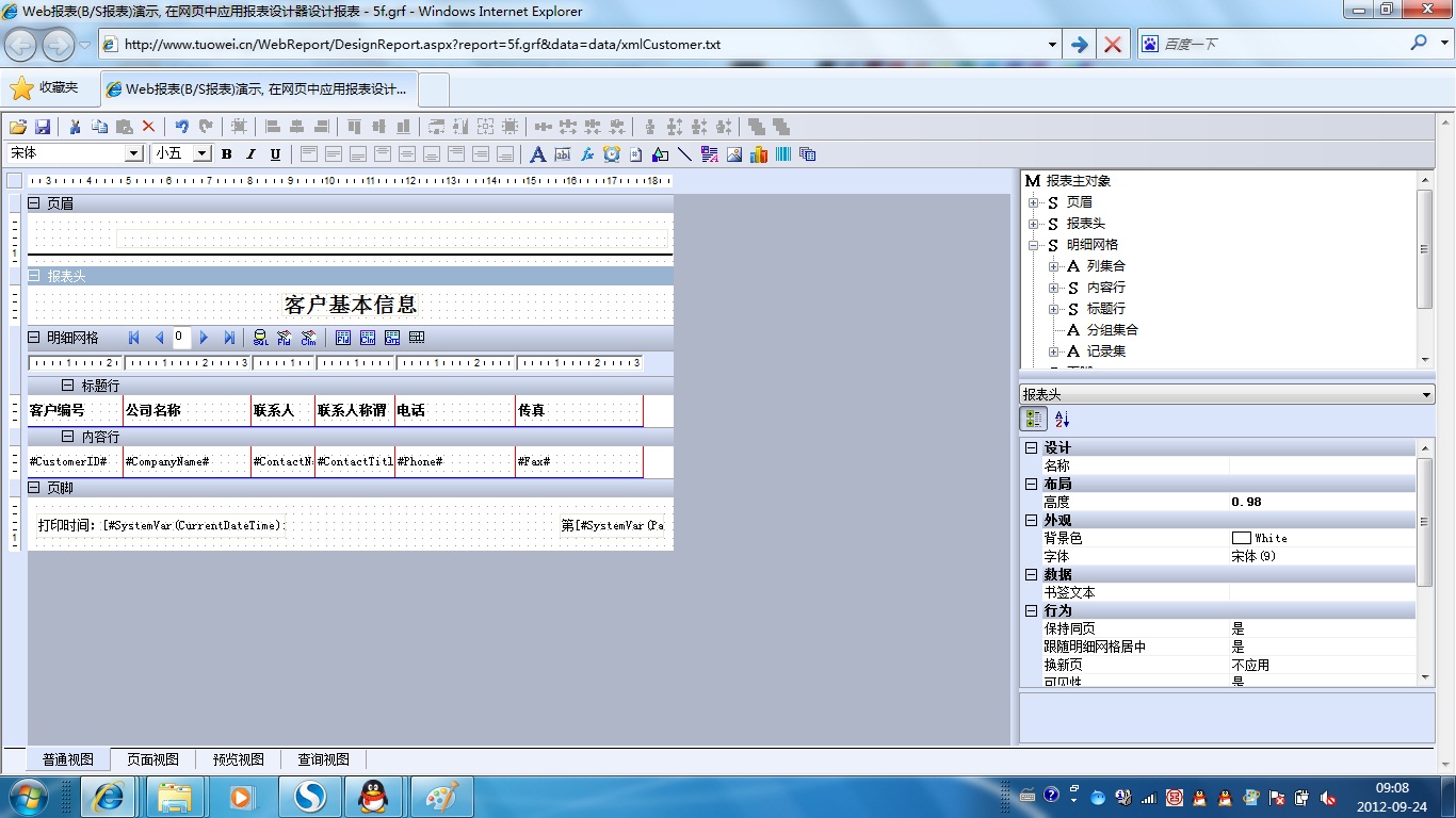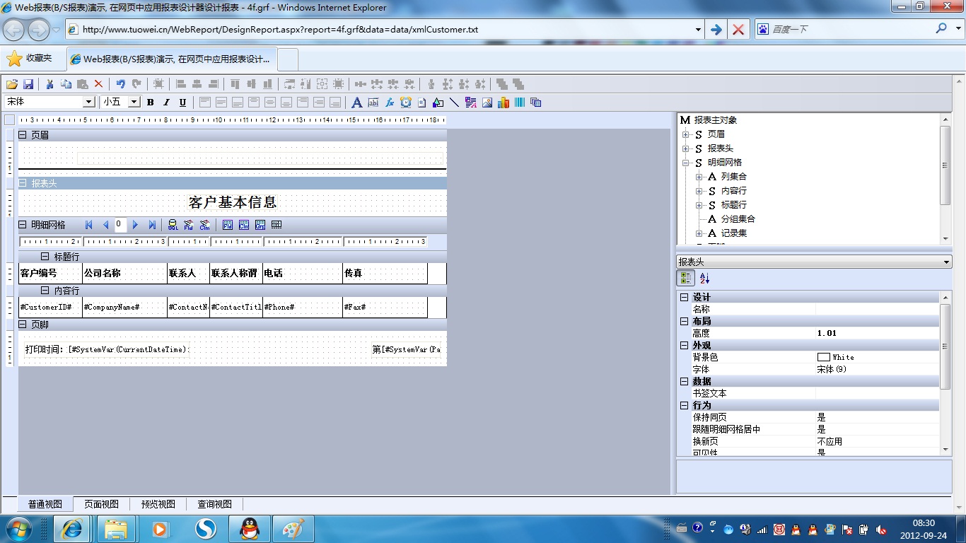 初次访问会自动下载安装报表插件,需要等待几分钟。始终不能看到演示报表,请看关于 IE 安全设置。