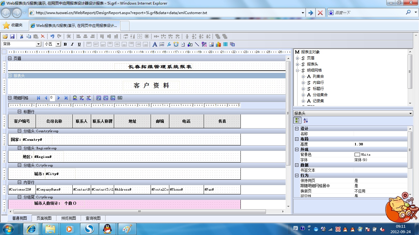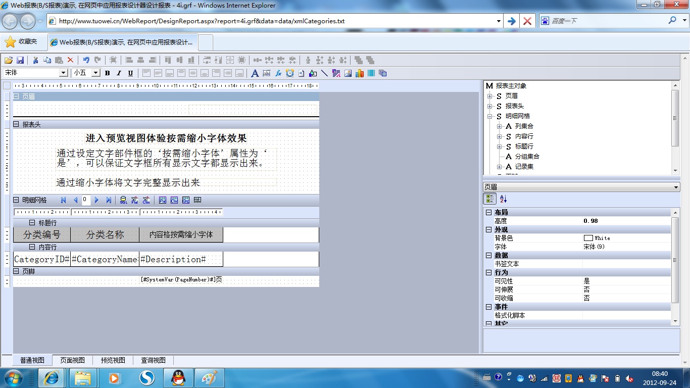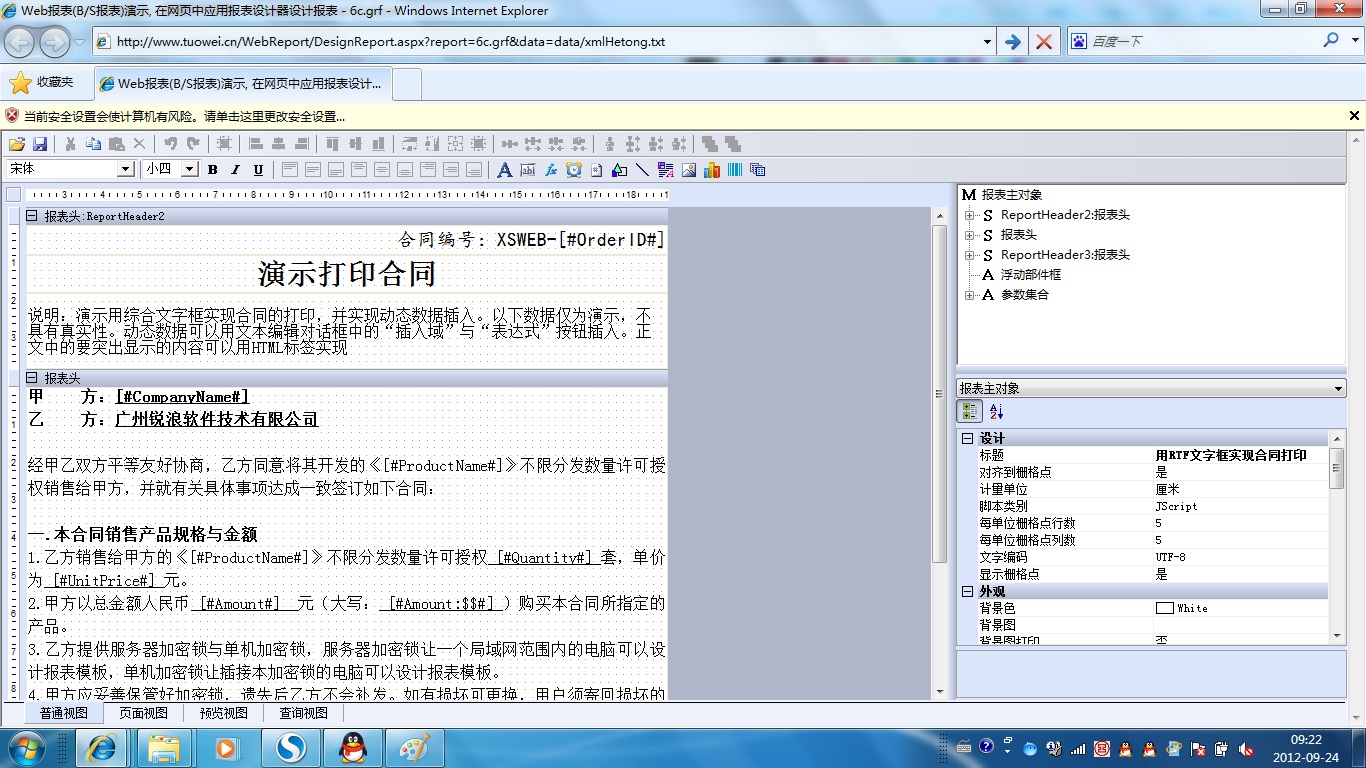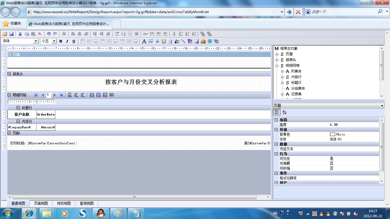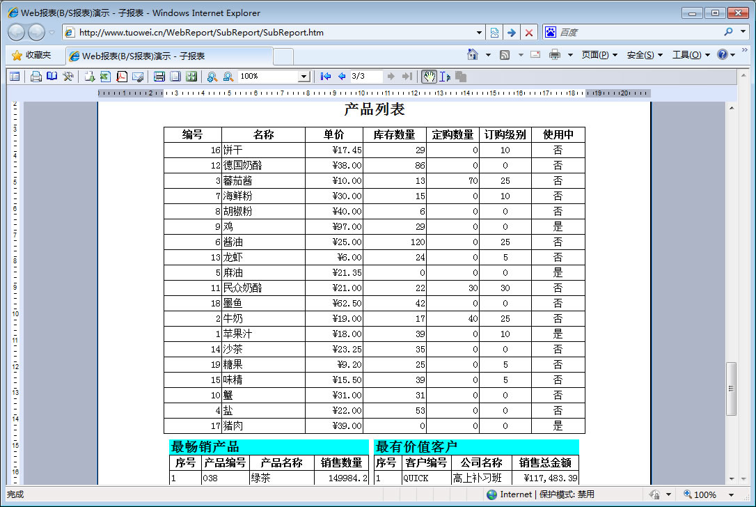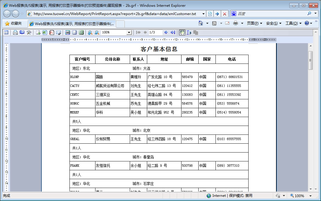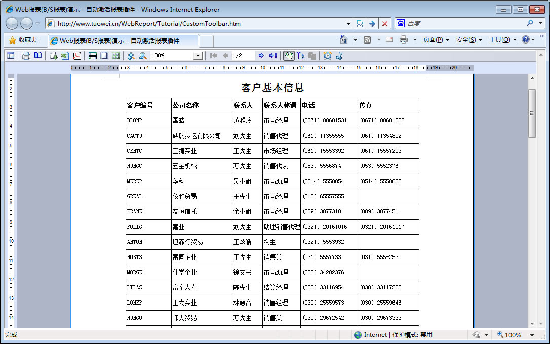 初次访问会自动下载安装报表插件,需要等待几分钟。始终不能看到演示报表,请看关于 IE 安全设置。