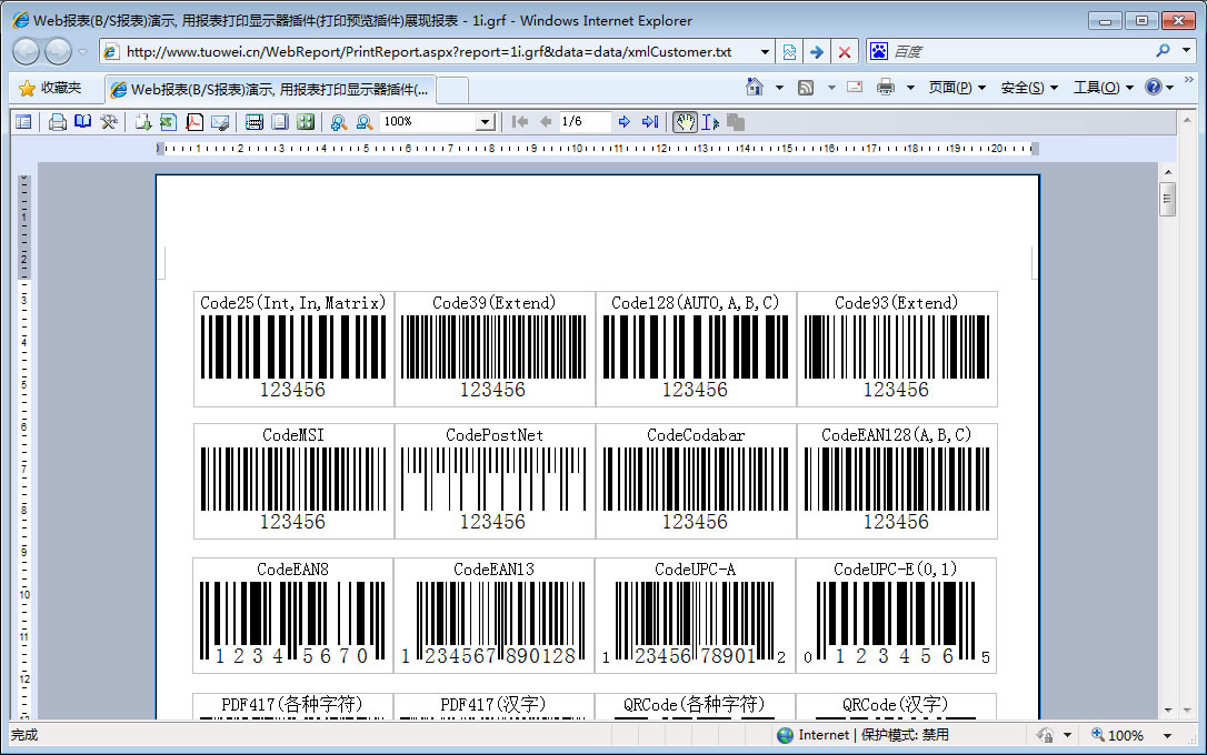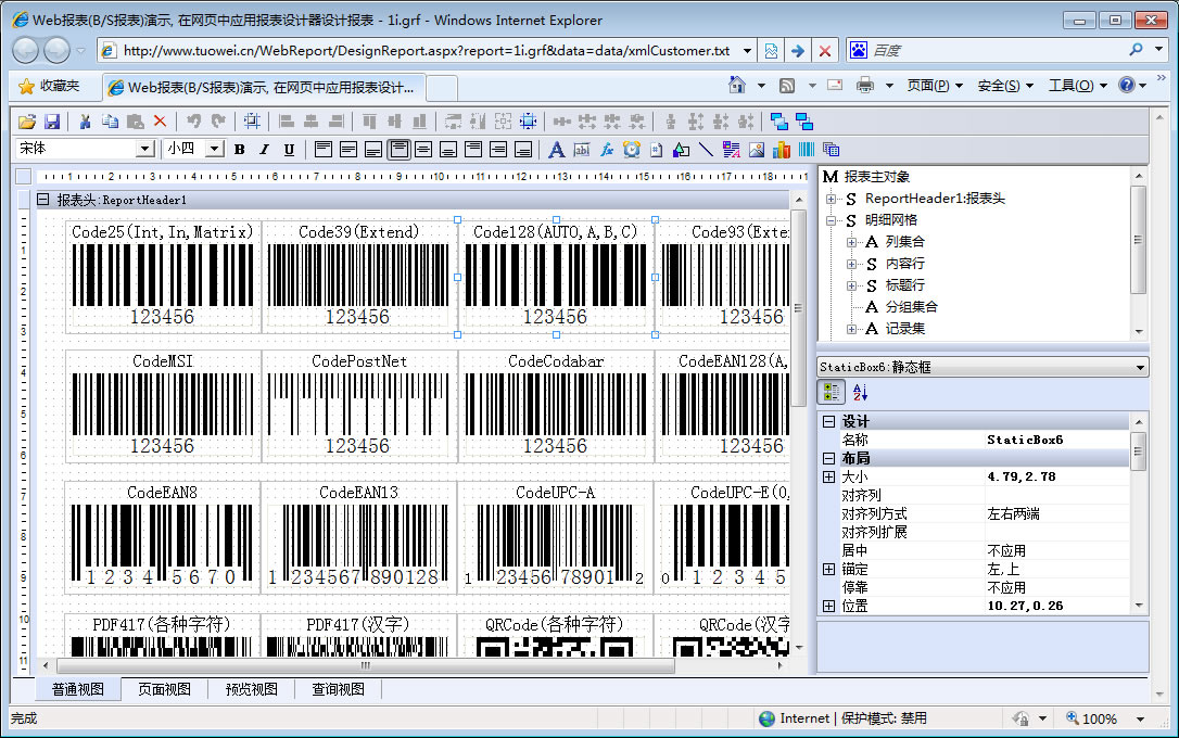 | 1i.条形码 | [设计] | 演示条形码,条形码数据将来自于关联的字段值。支持各种条常用的条形码。 | |
