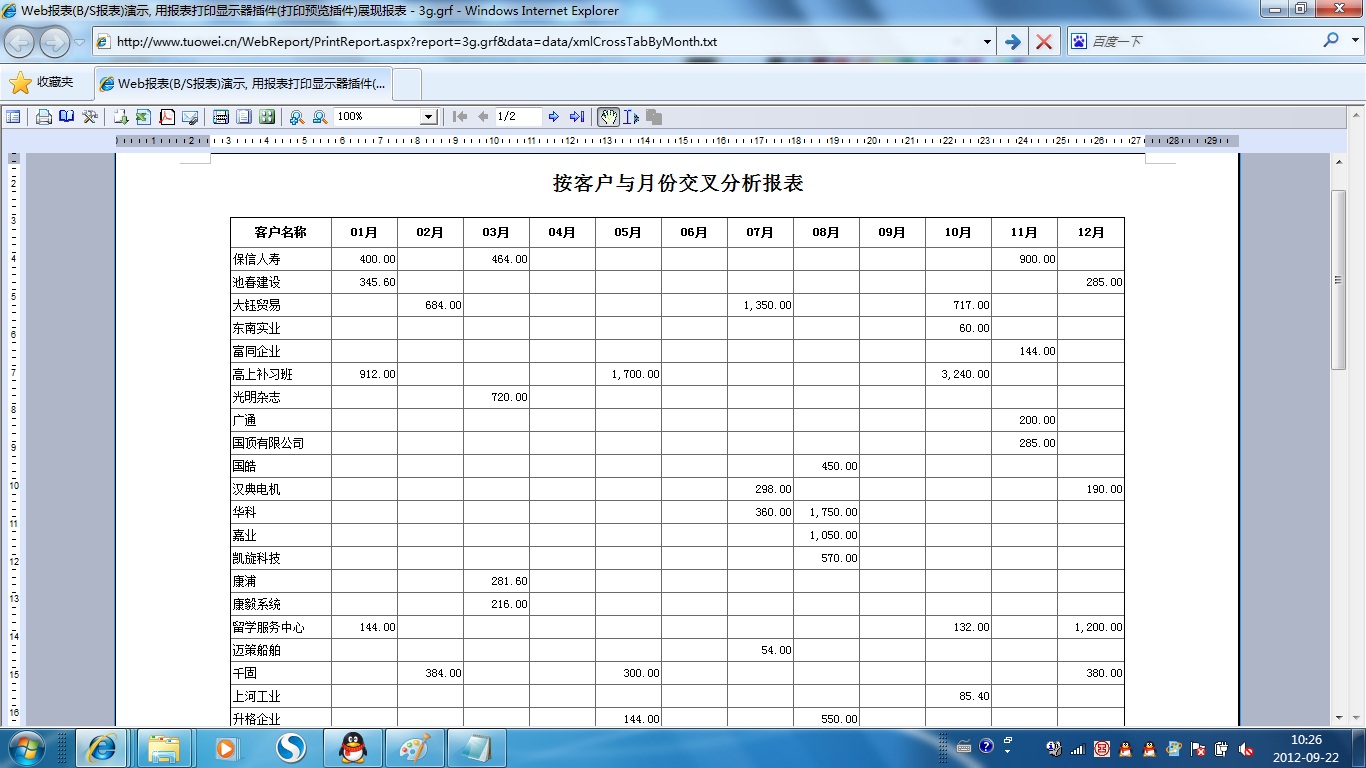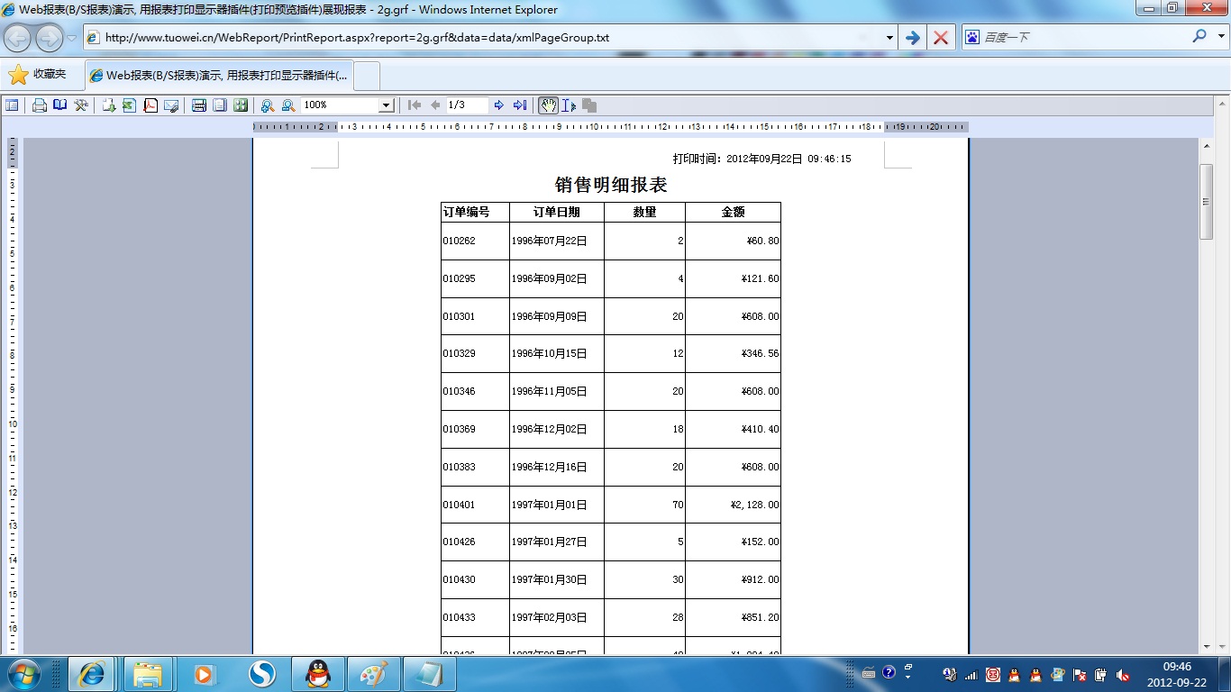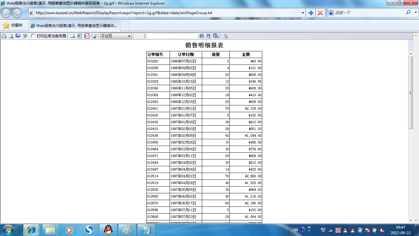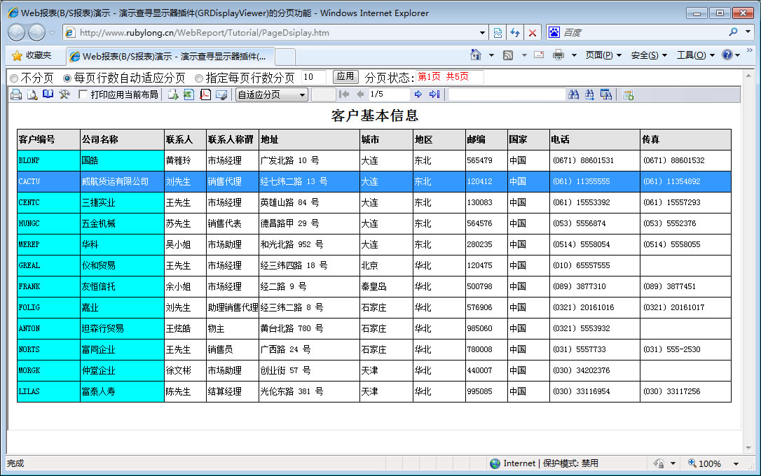 下面演示各种格式的报表,GR web报表展现分两种模式:报表打印展现与报表查询展现。点击报表名称列下的链接文字进入对应报表的打印展现模式。点击图标[查询]列下的链接图标进入对应报表的查询展现模式。报表查询展现模式一般用于明细表格类的报表展现,以连续不分页的方式查阅报表数据。