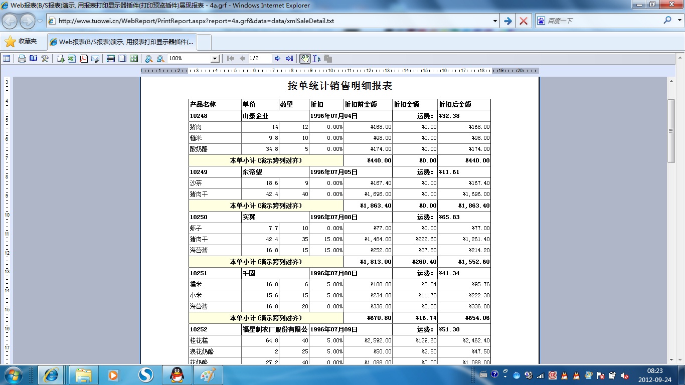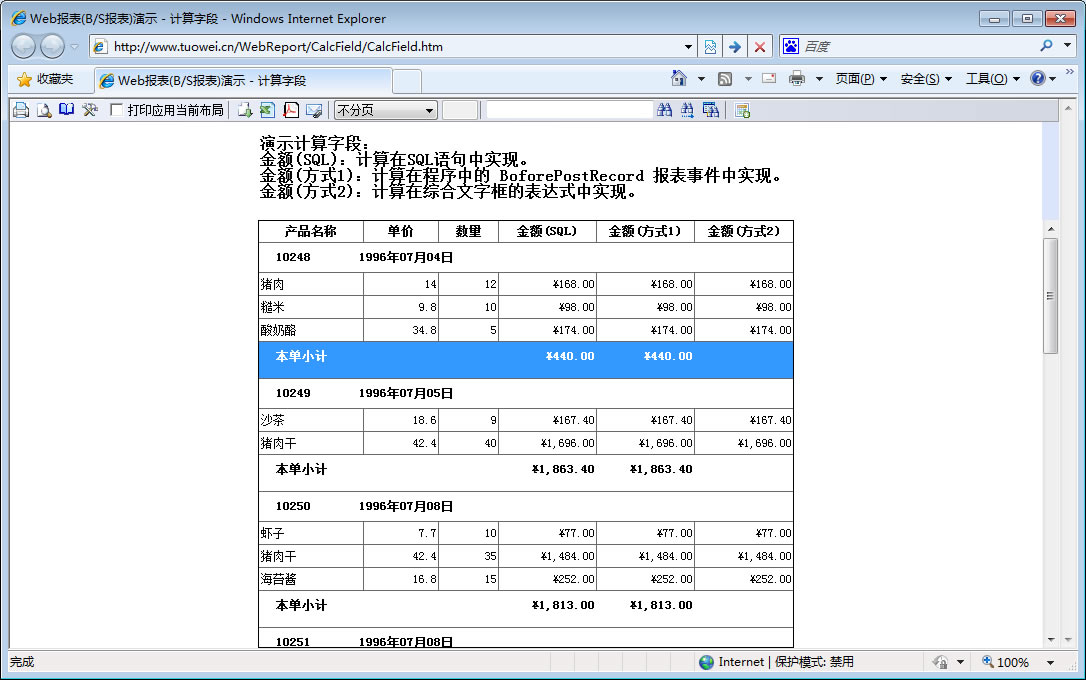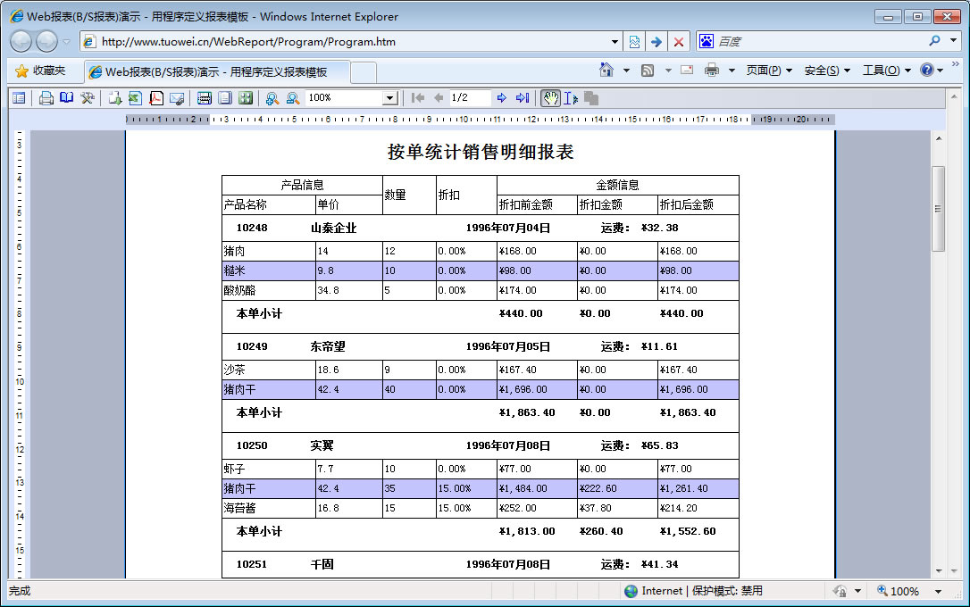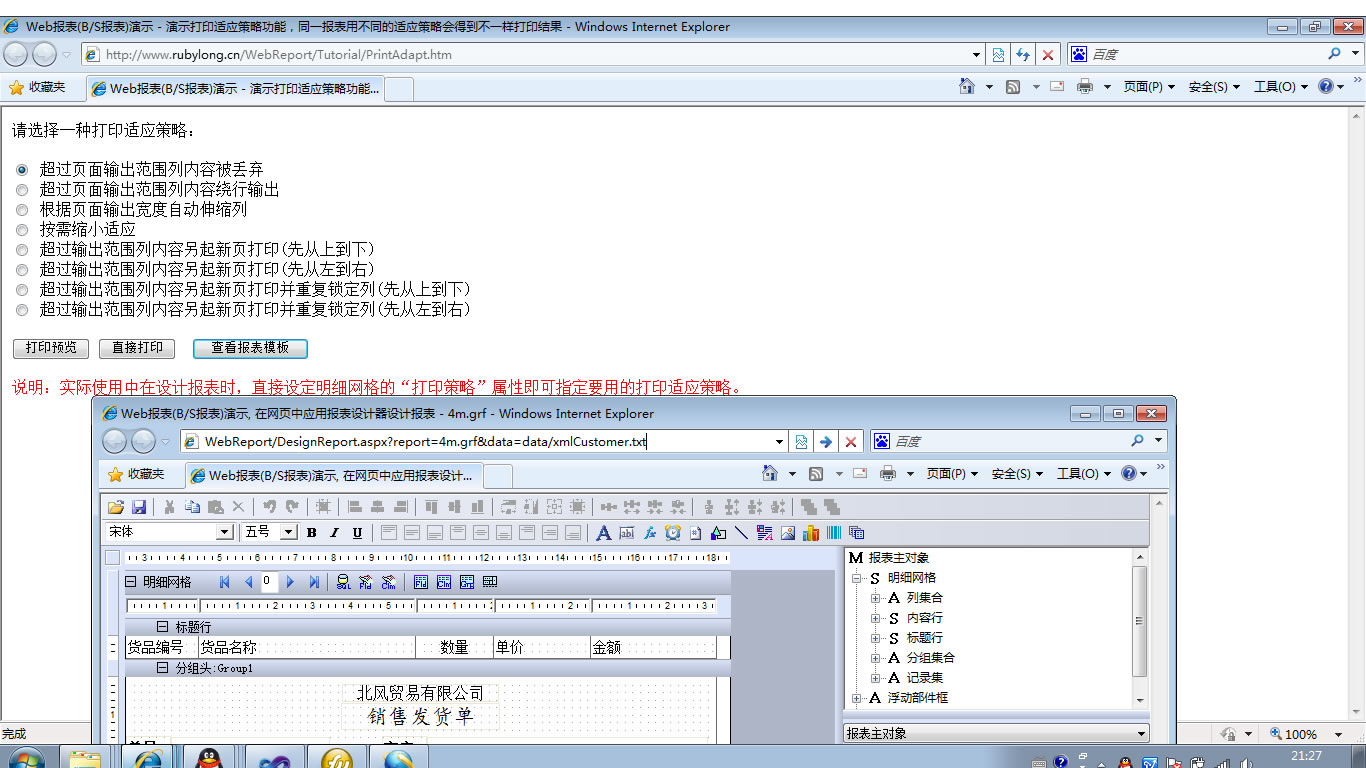 | 表格打印策略 | 用不同的打印策略打印同一表格报表,得到不同的打印结果。 | ||