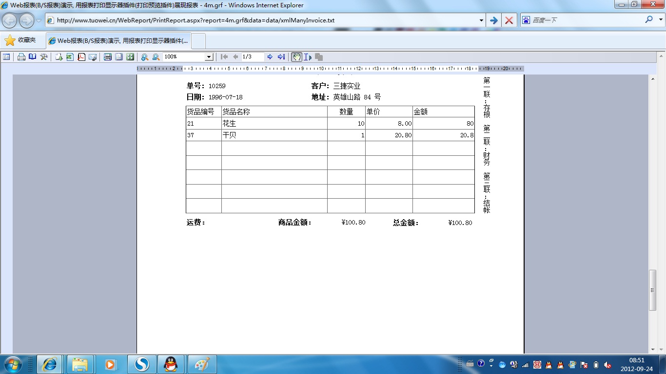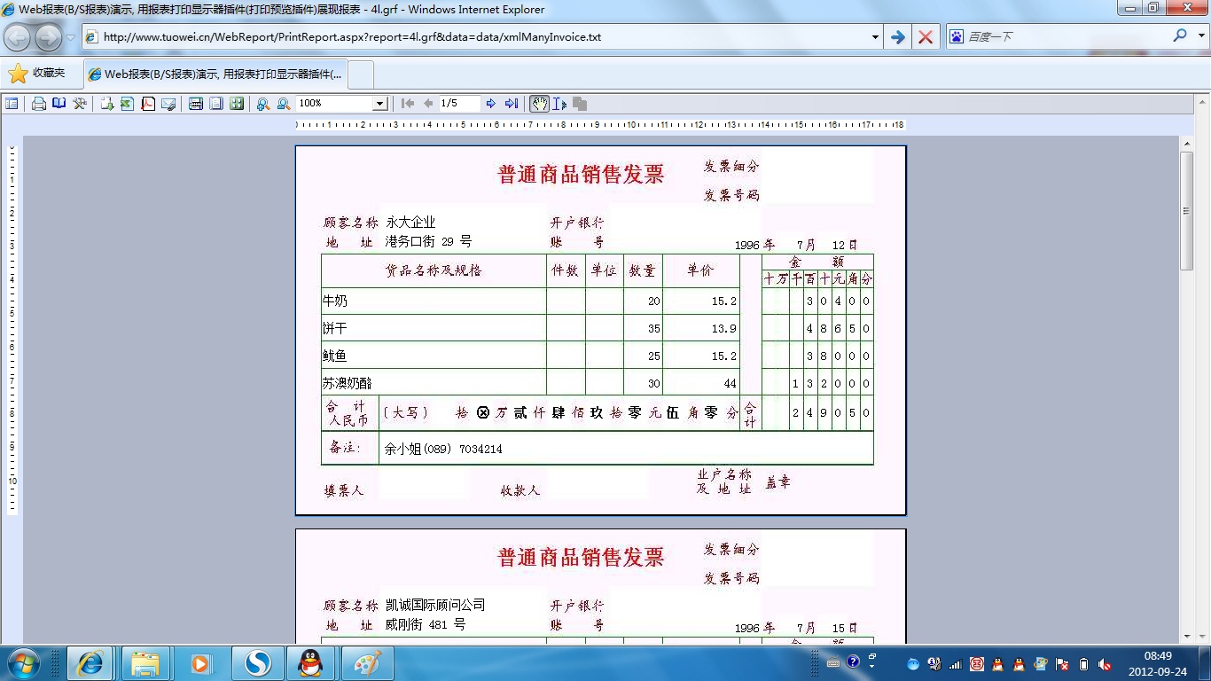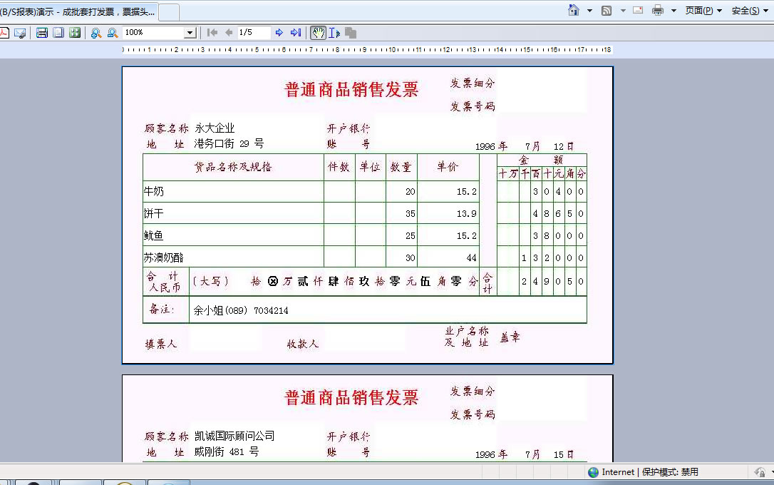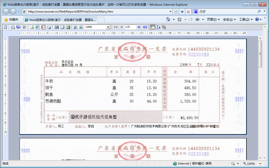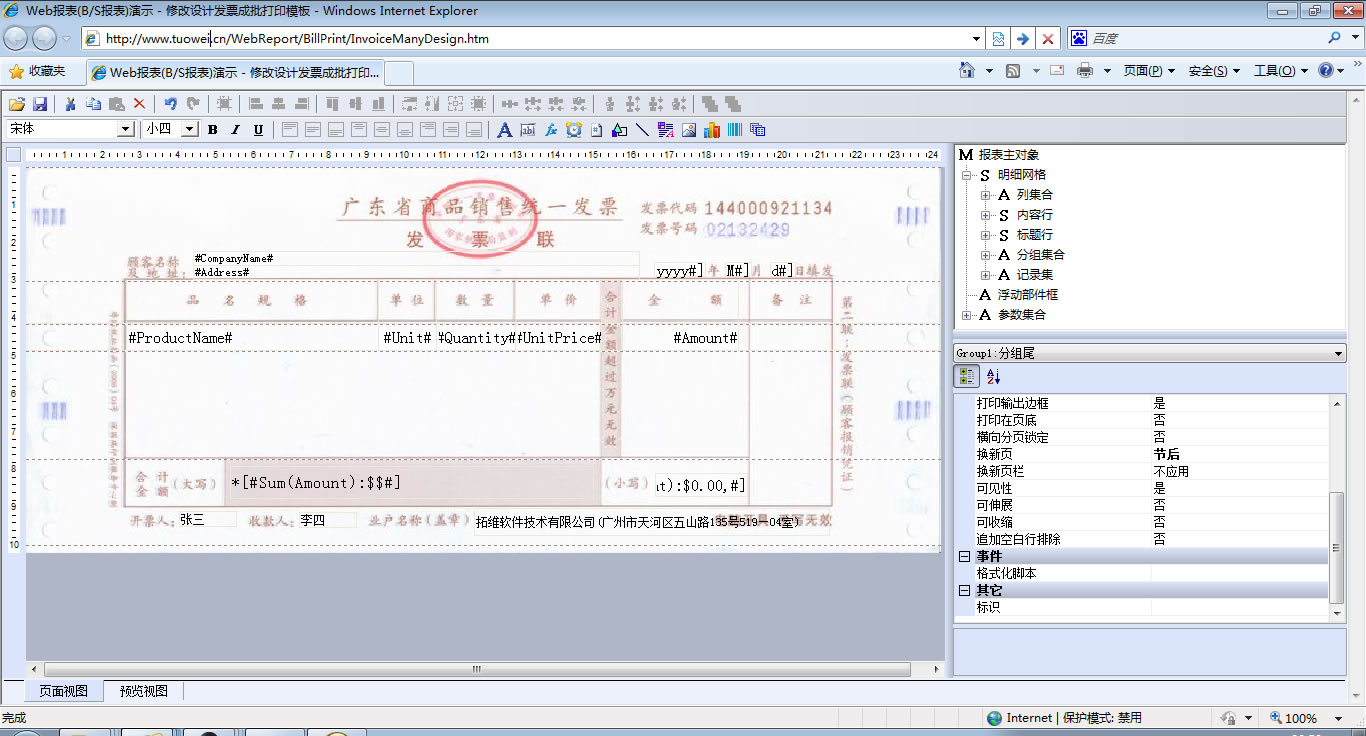 | 发票套打-多张打印 | 演示发票打印,通过分组实现多张发票一次打印,在分组头尾中显示票头与票尾信息。 | ||