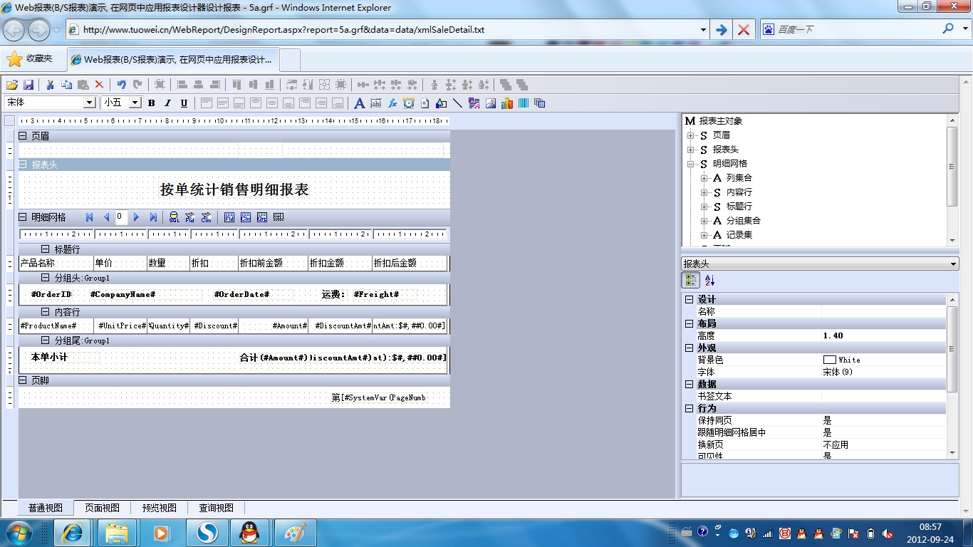 | 1k.明细自由编排 | [设计] | 将明细网格的标题格与内容格设为自由格,就可以像其它条幅式报表工具一样自由编排报表明细。 | |