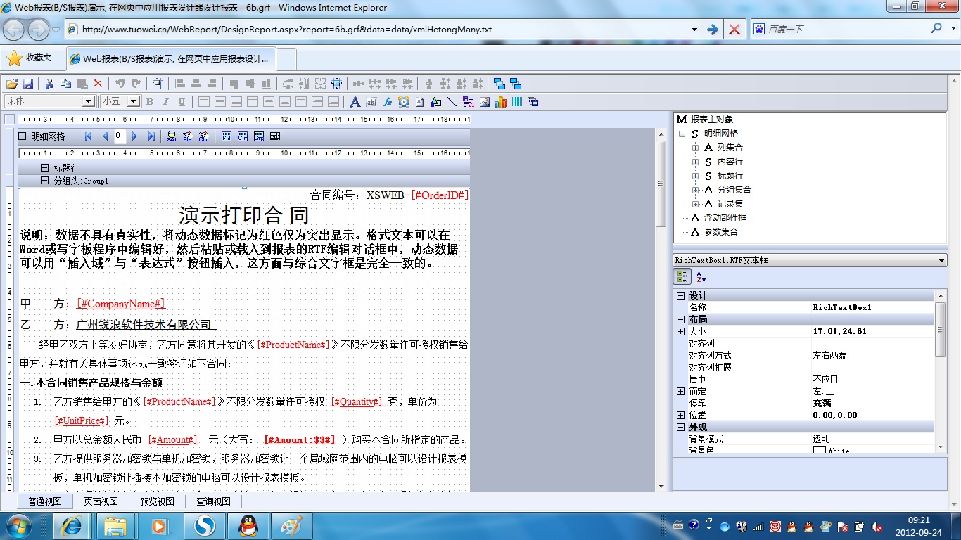 | 6a.合同打印(单份/RTF) | [设计] | 演示用RTF文字框实现一次打印一份合同。 | |