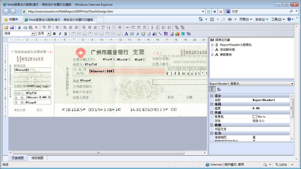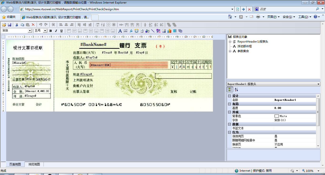 支票打印-演示加载报表参数 | 通过设置报表值,实现支票数据的打印。设计模板(调整打印位置) | |